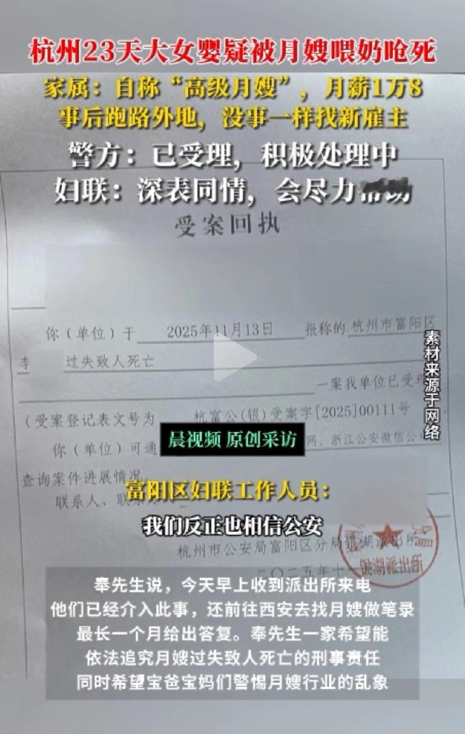 浙江杭州,男子花18000多的月薪雇了个高级月嫂,本以为能好好照顾刚出生的女儿。可谁知,女儿出生第23天,月嫂喂奶出现严重失误,不小心让孩子呛奶,她还极力隐瞒这一情况。男子和妻子听到孩子的哭声不对劲,赶紧送医治疗,在NICU住了五天,还是抢救无效死亡,妻子也因此重度抑郁。事后,保姆赶紧收拾东西跑回老家,完全像个没事人一样,急于寻找新的工作。民警提出让男子和保姆调解,保姆:我一点责任都没有,和我无关。 男子奉先生和妻子王女士终于迎来了第一个新生命,看着女儿的出生,两个人乐开了花。 第一次当爸爸妈妈没有经验,为了给孩子最好的照顾,夫妻俩千挑万选,花18000多元月薪雇了一个高级保姆。 保姆李某静,号称有六七年的工作经验、带过几十个宝宝,面试时,她还拿出各类证书,并自信满满声称会婴儿急救,这让夫妻俩彻底放了心。 可谁也没想到,10月9日凌晨,这个看似可靠的月嫂,却成了摧毁这个家庭的元凶。这天,女儿出生才23天,还没满月。 凌晨1点46分,宝宝的哭声打破了深夜的宁静,奉先生熟练地冲好奶,于1点54分送到婴儿房,嘱咐月嫂喂奶后,便轻轻带上门离开。 愿以为有专业月嫂的照料,宝宝肯定能安心吃奶入睡,却不知这才是噩梦的开始。 月嫂没有打开房间的主灯,只开了一盏微弱到监控都难以捕捉光线的小夜灯,就开始给宝宝喂奶。 刚喂了一分多钟,1点56分,宝宝突然发出第一声呛咳,紧接着是第二声、第三声,随后便是持续不断的、像是喘不上气的异常哭声,那声音和平时清脆的哭声截然不同。 这揪心的哭声整整持续了26秒,可月嫂却毫无反应,依旧继续给孩子喂奶,直到1点58分才慢悠悠放下奶瓶。 又过了一分钟,她才不紧不慢地打开房间灯查看宝宝状况。 被哭声惊动的奉先生冲进房间查看情况,连忙追问是不是呛到了,保姆却斩钉截铁地否认,只说孩子不好好吃奶。 直到接近2点,她才敷衍地把孩子趴放在腿上拍了拍后背。 王女士也被不安的情绪笼罩,匆匆赶来查看,发现女儿口中流出透明的拉丝粘液,月嫂却轻描淡写地辩解是宝宝在拉屎。 随后几分钟,宝宝开始浑身出汗,小手无力地挣扎,嘴唇渐渐变成了紫色。 王女士吓得声音发颤,几乎要哭出来的问,孩子这嘴唇颜色紫色正常吗? 这时月嫂才慌了神,含糊地说要不我们还是去医院吧。 王女士急得让月嫂做海姆立克急救,可这位自称受过专业培训的月嫂,只是机械地拍着宝宝的后背,并不会所谓的急救。 奉先生一边拨打120咨询急救方法,一边转告月嫂用两根手指按压宝宝胸部,可月嫂依旧手足无措,只是胡乱地用手掌拍打孩子胸口。 眼看孩子情况越来越差,奉先生来不及多想,抱着宝宝就往车里冲。一路上,奉先生不顾交通规则闯了好几个红灯。 宝宝被紧急送进抢救室,医生诊断为呼吸心跳骤停和窒息。 可让奉先生愤怒的是,作为唯一全程在场的人,月嫂向医生描述时,竟刻意隐瞒了真相,只说“宝宝就喝了两口奶,呛住了,我们马上就送过来了”。 直到后来看到医生的抢救记录上写着“呛咳半小时,发色发绀、呼吸减弱17分钟”,奉先生才知道月嫂隐瞒了关键信息,这份虚假的描述严重干扰了医生的判断。 医生将宝宝转院到杭州专业的儿科医院,可在NICU抢救了五天后,医生还是无奈地通知他们放弃治疗,宝宝也抢救无效死亡。 事后,巨大的打击让王女士瞬间崩溃,患上了重度抑郁。 更让人无法接受的是,事后协商时,月嫂不仅坚决宣称,她连0.1%的责任都没有,甚至拒绝退回工资和任何人道主义赔偿,还恶人先告状,谎称宝宝有基础病。 事发后的第二天,月嫂就收拾行李逃回了西安老家,回去后竟像个没事人一样,立刻在朋友圈发布求职信息。 目前,警方已介入调查,前往西安找月嫂做笔录。 原本充满希望的家庭,因为月嫂的失职和冷漠变得支离破碎。 首先,奉先生可以追究月嫂的过失致人死亡责任。 《刑法》第二百三十三条规定,过失致人死亡的,处三年以上七年以下有期徒刑;情节较轻的,处三年以下有期徒刑。 李某静明知新生儿呛奶可能引发窒息风险,却在昏暗小夜灯环境下喂奶,听到宝宝连续呛咳和异常哭声后未立即停止喂奶、排查风险,反而继续喂食,存在明显的疏忽大意过失。 呛奶发生后,她未及时采取规范急救措施,隐瞒呛奶关键事实导致医生误判,延误了最佳抢救时机,导致孩子死亡,其行为已涉嫌过失致人死亡罪。 《民法典》第一千一百六十五条规定,行为人因过错侵害他人民事权益造成损害的,应当承担侵权责任。 某静与奉先生夫妻之间形成了家政服务合同关系,其核心义务是提供专业、安全的新生儿照料服务,而她在履行合同过程中存在严重过错,理应承担侵权损害赔偿责任。 李某静在事故发生后未履行基本救助义务,属于典型的过错行为,其过错行为造成了明确的损害后果,应当承担相应的赔偿责任。