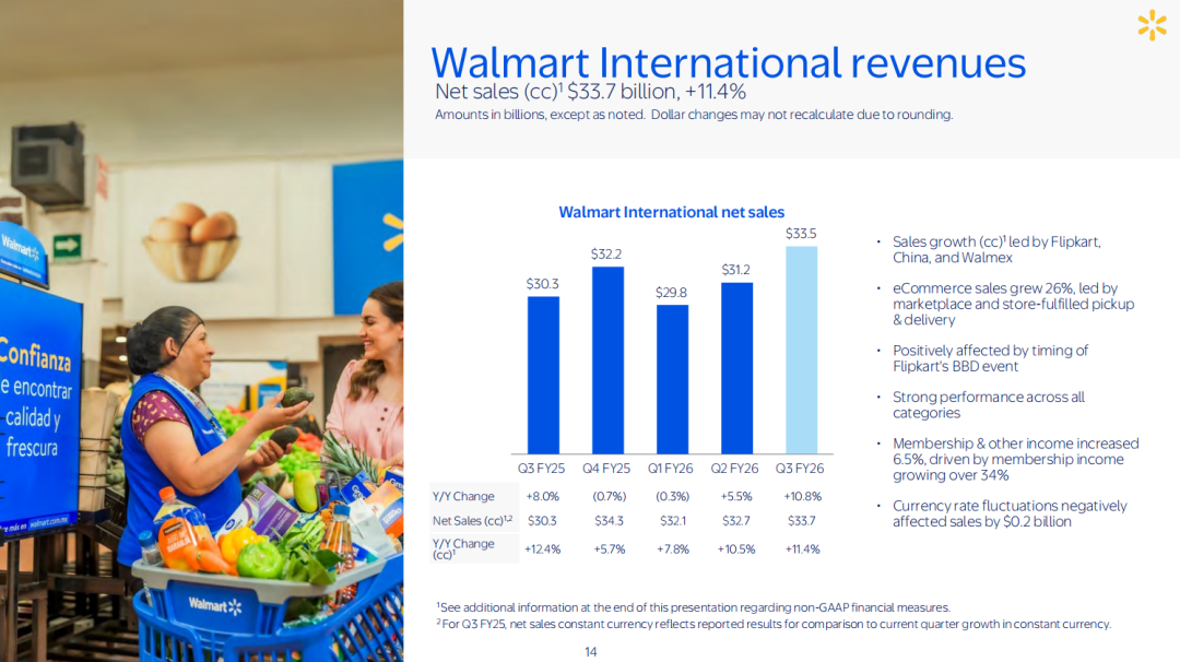沃尔玛指出,国际业务实现了稳健的营收增长,这主要得益于(印度电商业务)Flipkart、中国和Walmex(注:墨西哥和中美洲沃尔玛)的强劲表现。