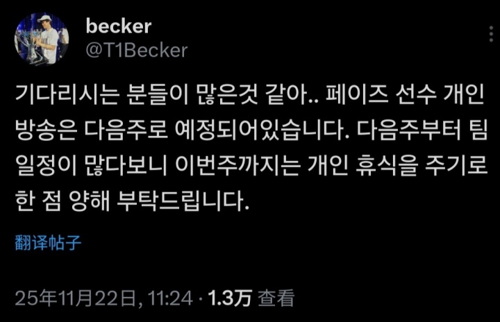 直播吧11月22日讯近日T1官宣Peyz加入队伍签约三年,随后有许多粉丝询问T1,关于Peyz的直播安排,T1团长更推:好像有很多人在等待…Peyz的直播预定在下周进行,由于下周开始团队的行程很多,所以到本周为止会给予选手个人休息,敬请谅解