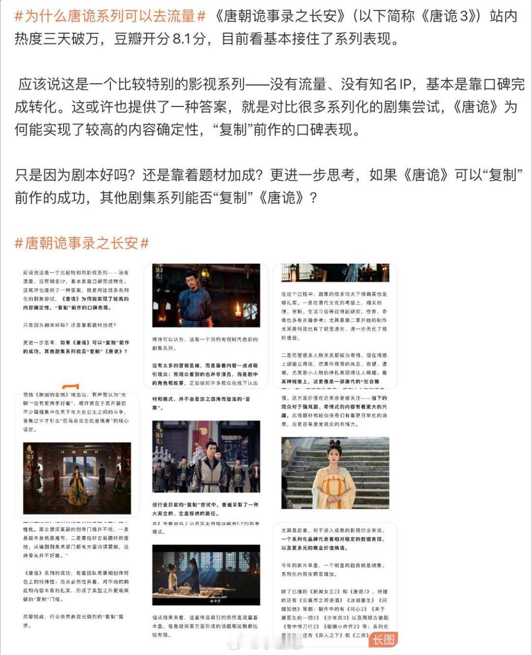 《唐诡3》越拍越像“国产美剧”?比剧情更牛的是它的工业化!大家有没有发现——《唐诡3》不是第三季变强,而是整个团队已经跑进“国产美剧模式”了。很多人只看表面是“第三季热度又爆了”,但我越追越觉得:唐诡是在用国产古装剧里最难的方式做最不可能的事——工业化。几点直接说明:① 主创团队稳定到恐怖第三季换导演但味道没变,就是因为:灵魂编剧魏风华没变。这就是美剧“showrunner中心制”的影子。② 把观众的话真的听进去了从第二季起,观众想看的人物、想留的风格、想加的预告方式,主创真的在做。这在内娱非常非常罕见。③ 角色线更像美剧风第三季从金桃案开始,就明显不是“单元推理”,而是:权谋主线带多条人物弧线并行。苏无名、卢凌风对皇权的牵连,樱桃的成长,主角团之间的微妙关系……这不就是美剧“角色群像”的典型写法?④ 衍生宇宙开始了竖屏微剧、番外短剧都确认了。你敢信?国产单元剧系列居然也能长成“宇宙”我们都知道内娱拍续集有多难:换编剧、换导演、演员不续约、制作不稳定、资本乱入……太多本来能拍成“系列”的作品都死在续集中。我说真的:《唐诡3》最强的不是剧情,是它背后那股“内娱罕见的野心”。说真的,这季《唐诡》火得不得了,连带着周边内容也跟着出圈了。前阵子刷到一个“唐诡番外”,完全不输正片!结果一看才发现,是度小满找杨志刚拍的广告片。居然把苏无名的“六合酥山店”也拍成番外,探案如神的苏博士,开店居然也会遇小麻烦。剧情丝滑到完全不像广告,看起来就像正剧没播完的小片段,顺滑自然,超有代入感。剧情不够看的,可以去看看!唐朝诡事录之长安‖