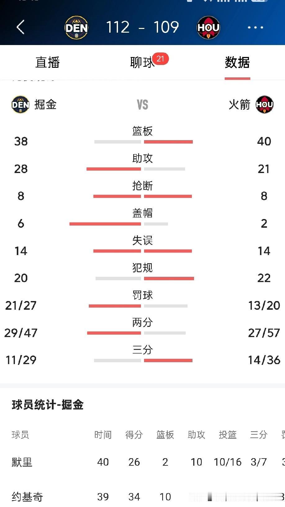 火箭本场比赛与掘金说实话打的难分难解,112-109输给掘金就是关键体现。唯一的问题就是组织串联的问题,申京本场还是被约基奇打爆了。