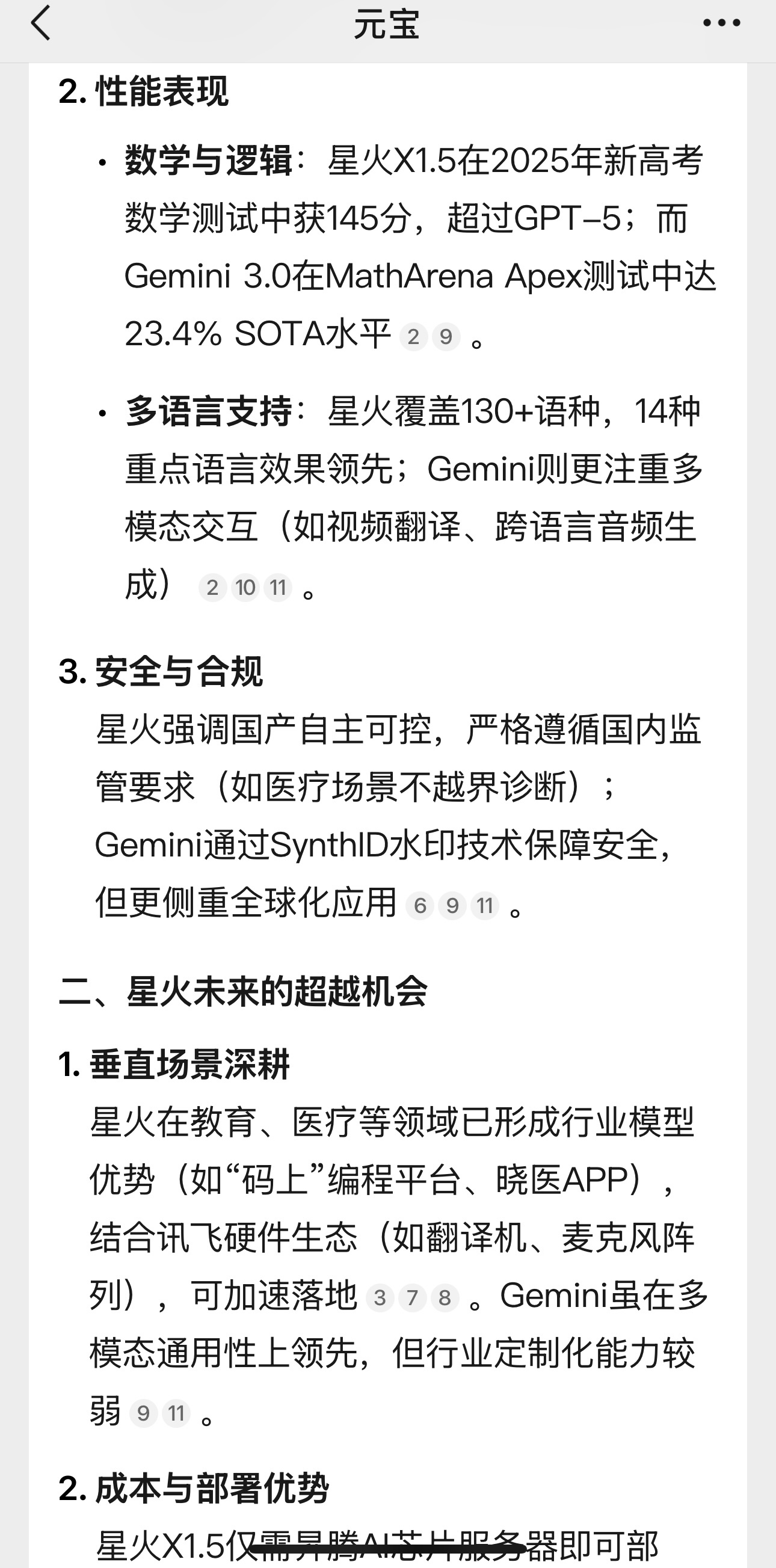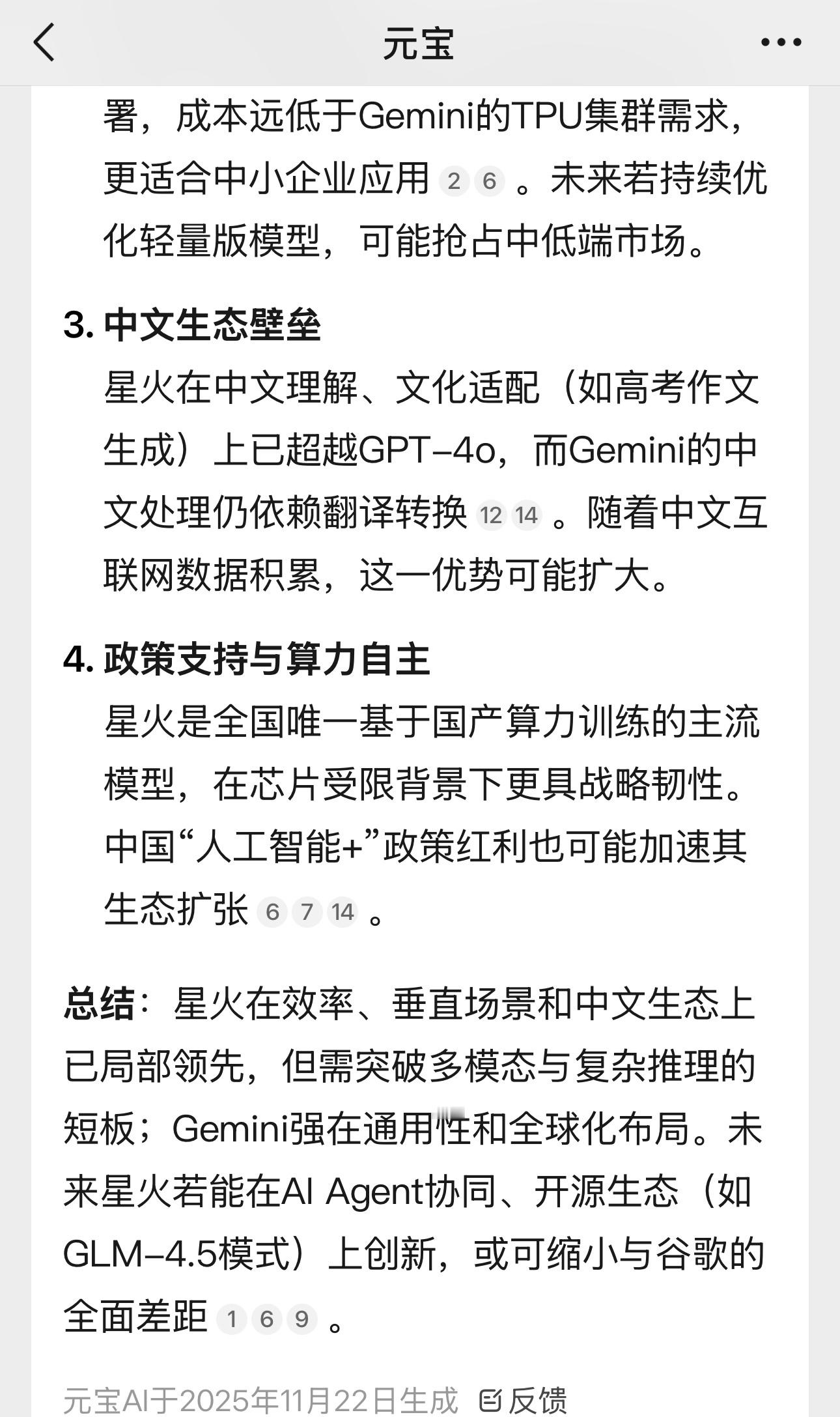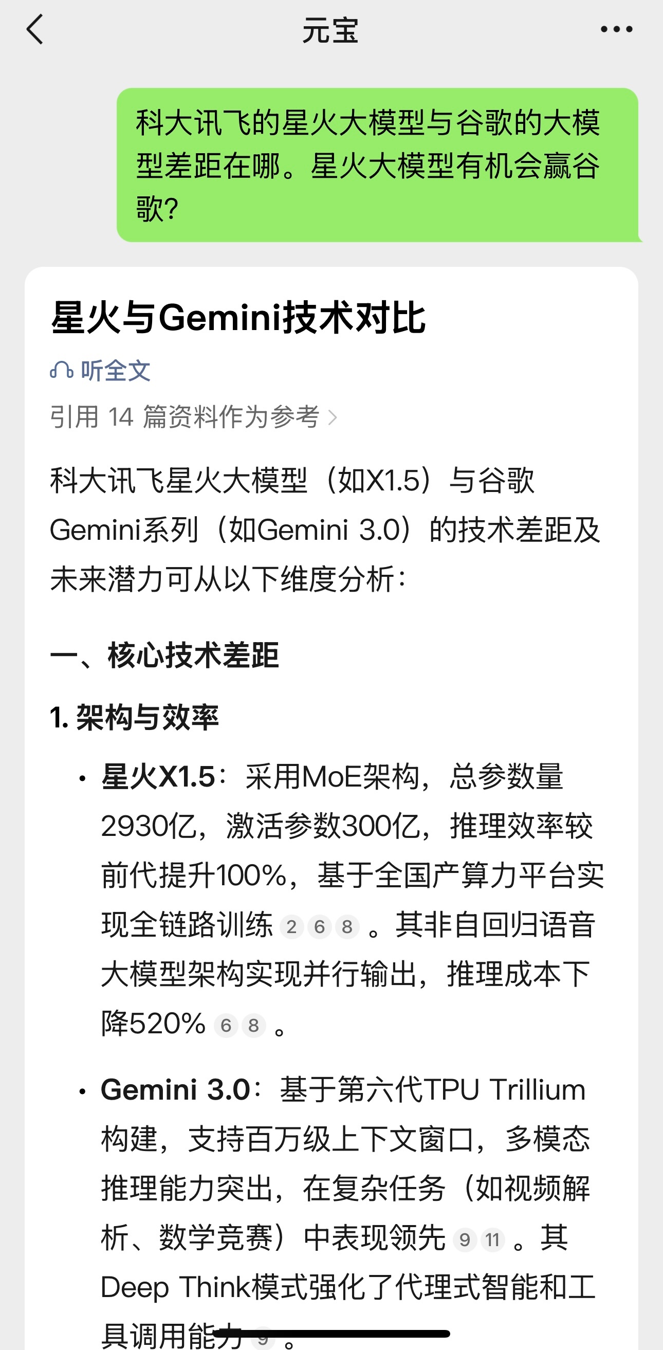 我问元宝,科大讯飞的星火大模型与谷歌大模型的差距在哪,未来有机会赢谷歌?元宝说:
