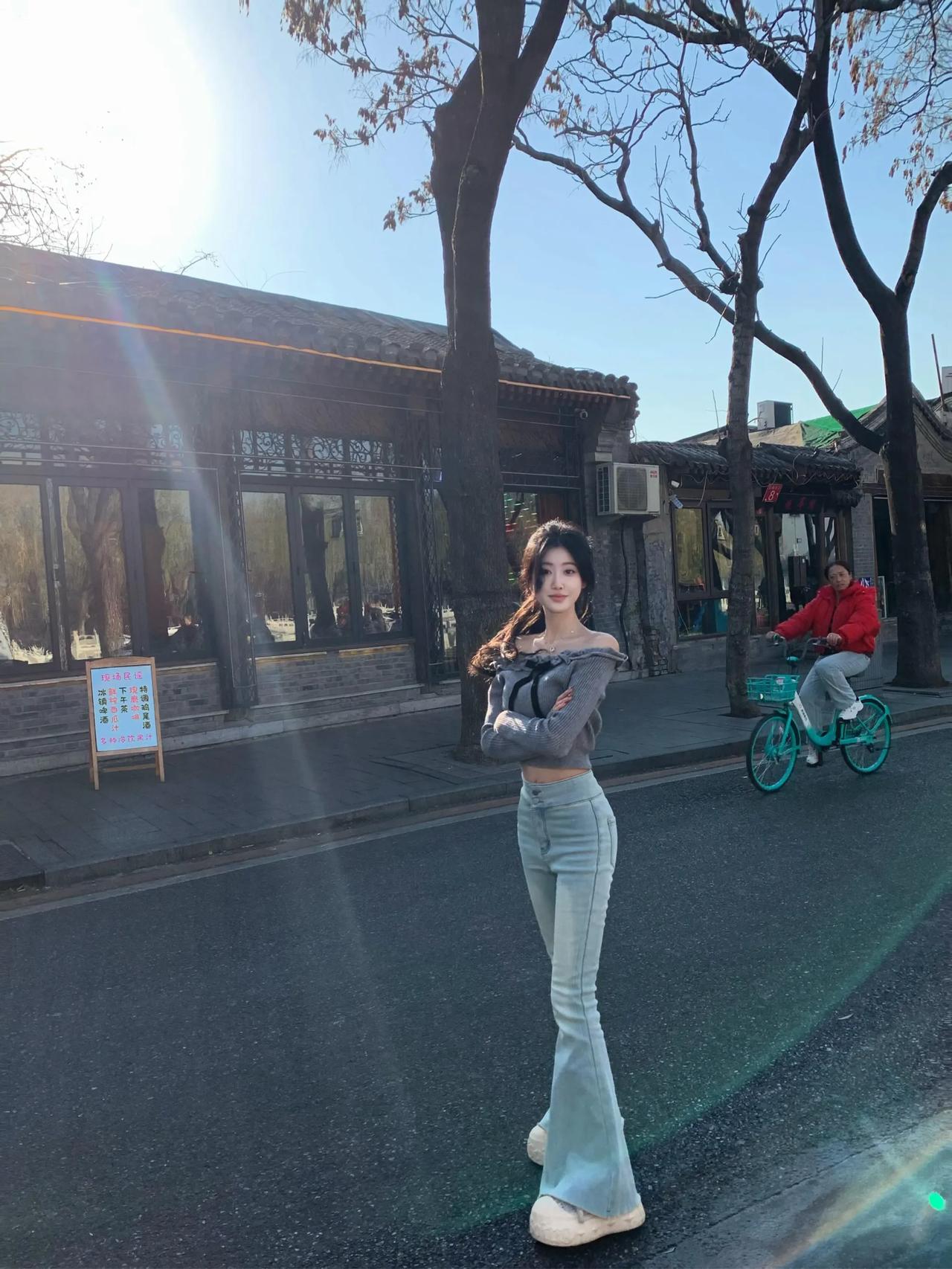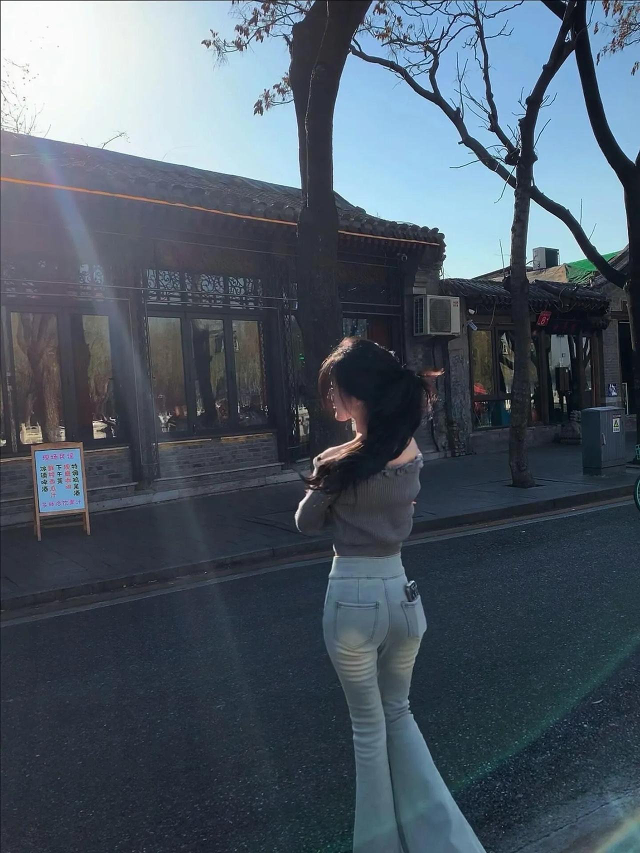 阳光明媚的日子里,少女在古色古香的小巷里摆拍。