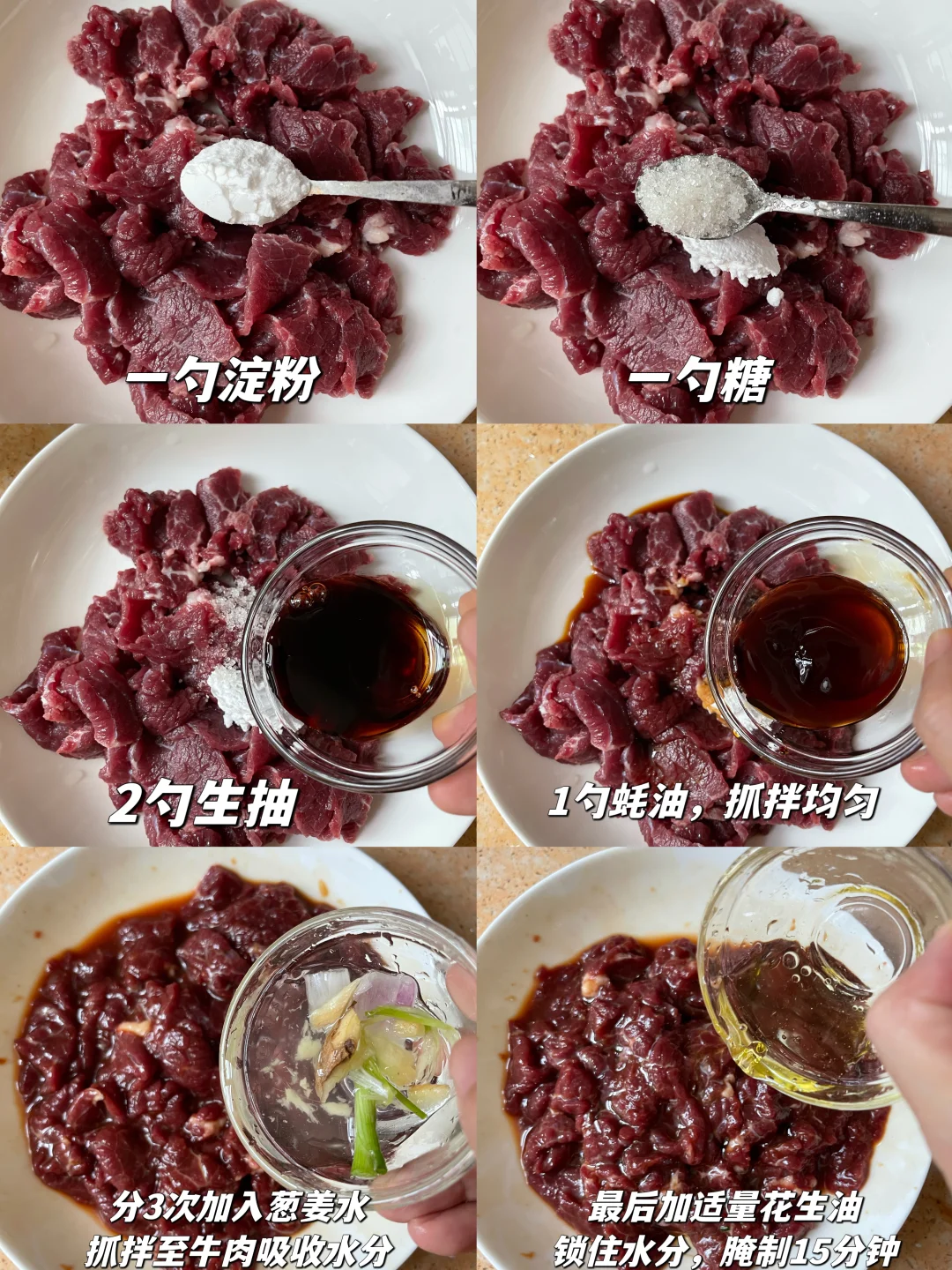 1️⃣牛肉横纹切片,参考☝️图片腌制15分钟