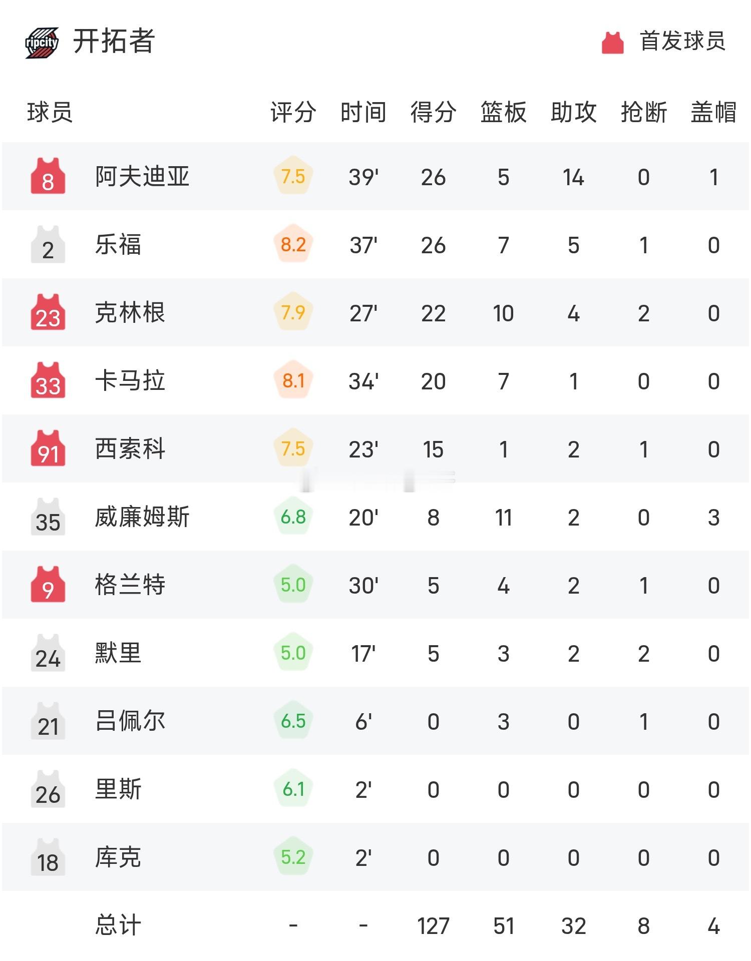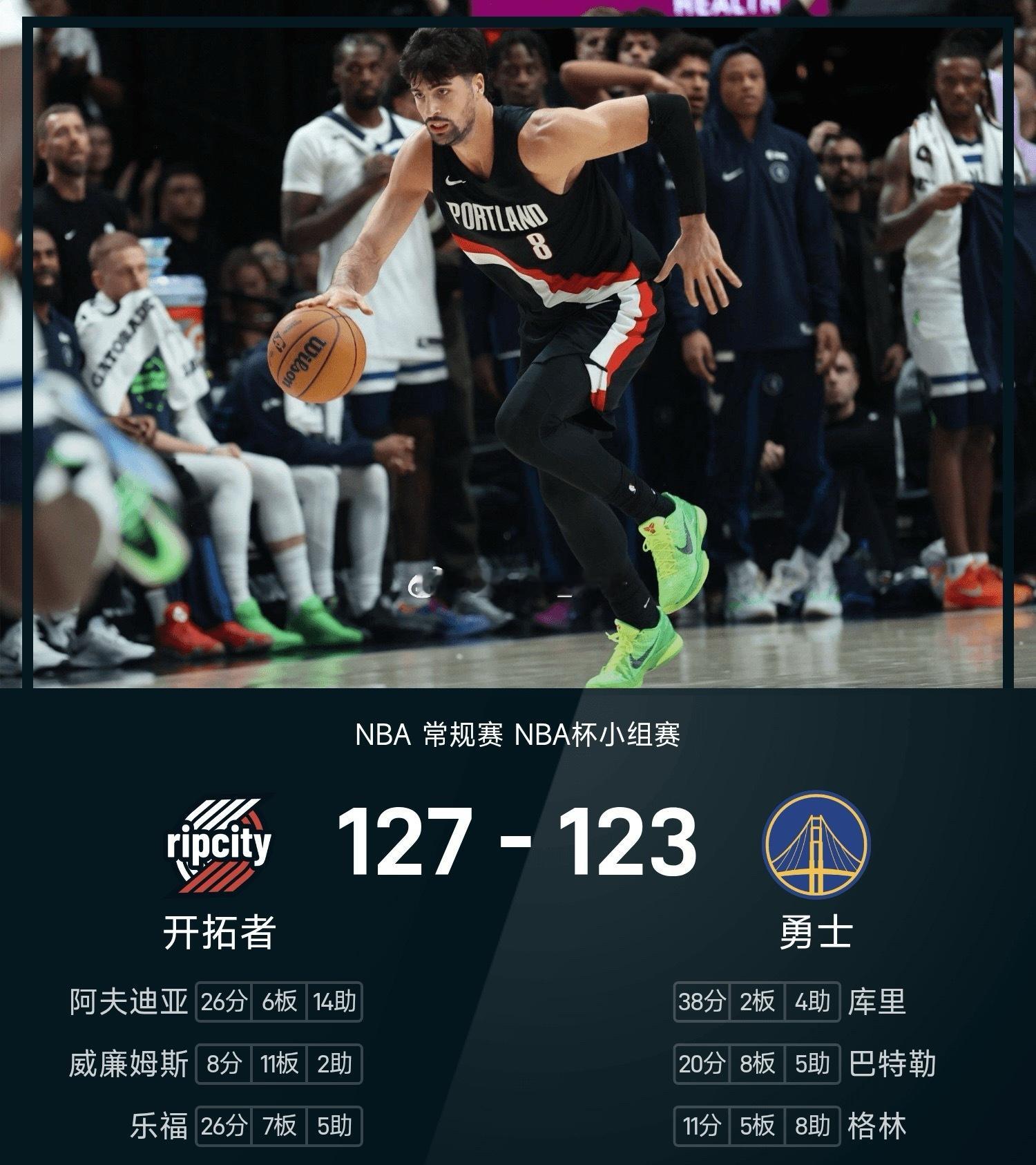 11月22日讯 25/26赛季NBA 常规赛 NBA杯小组赛,勇士对阵开拓者。双方全场战罢,勇士123-127不敌开拓者。阿夫迪亚得到26分5板14助率队取胜,库里空砍全场最高的38分2板4助。