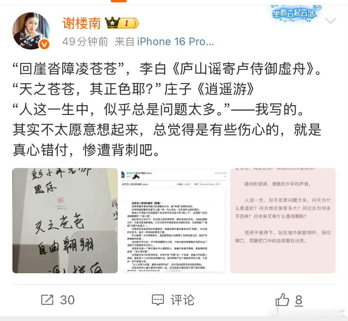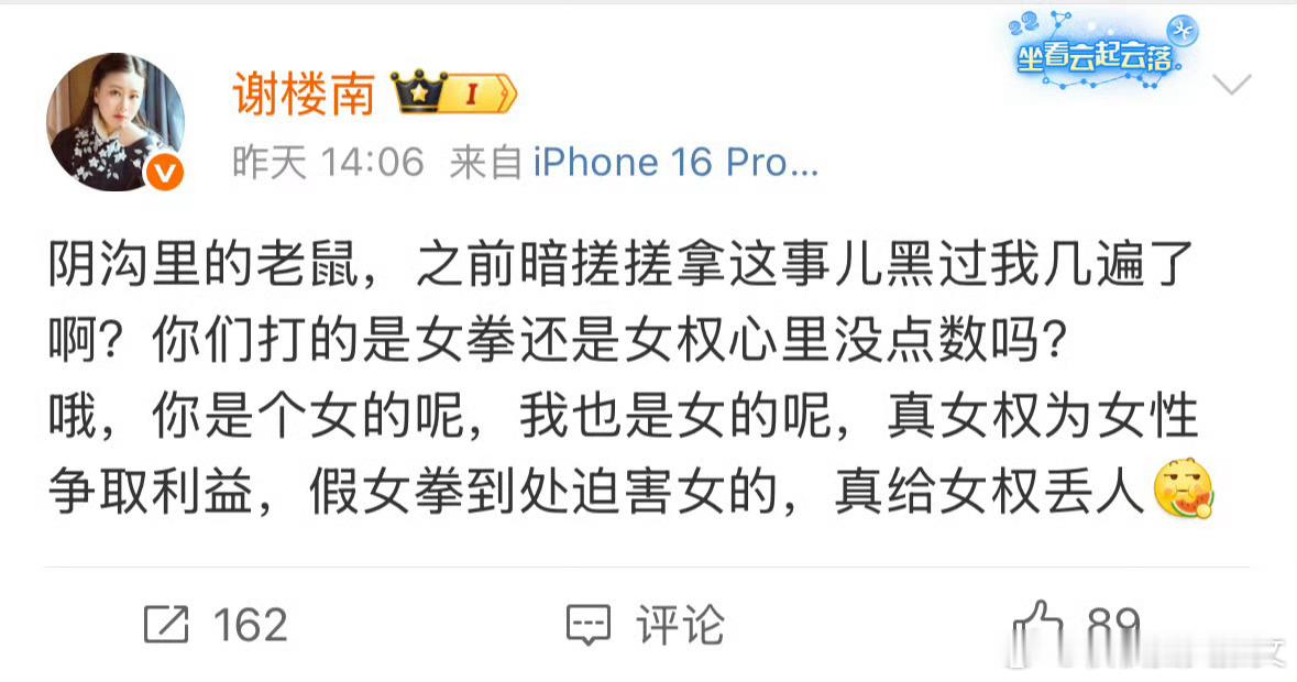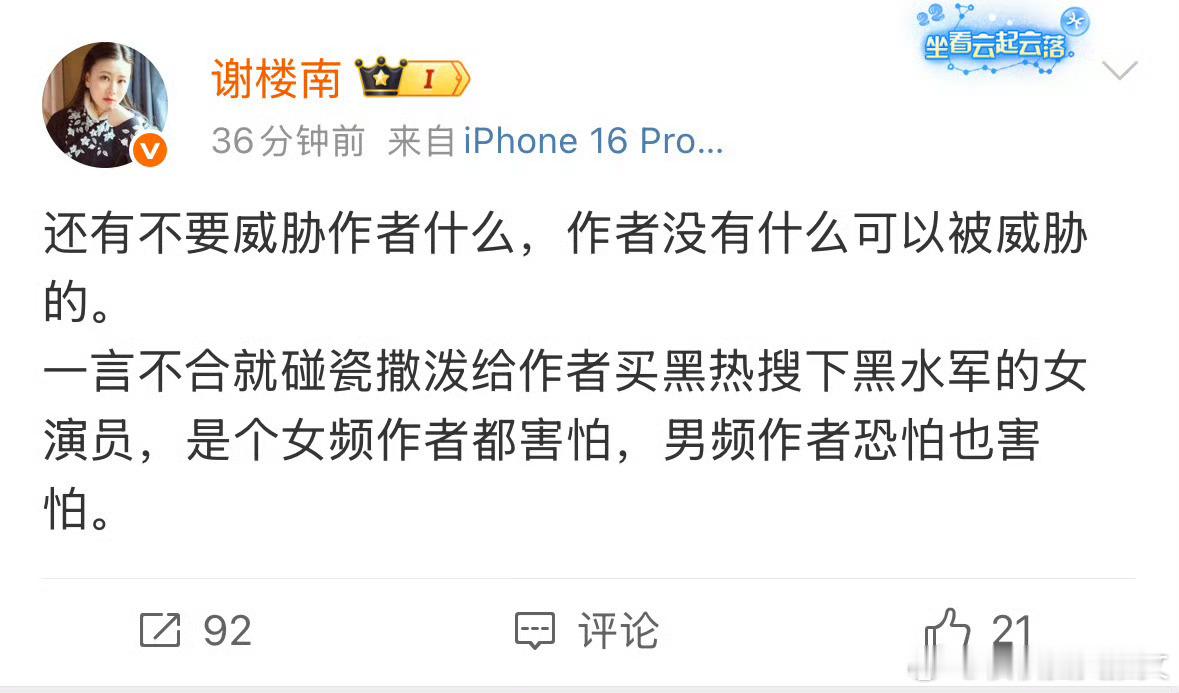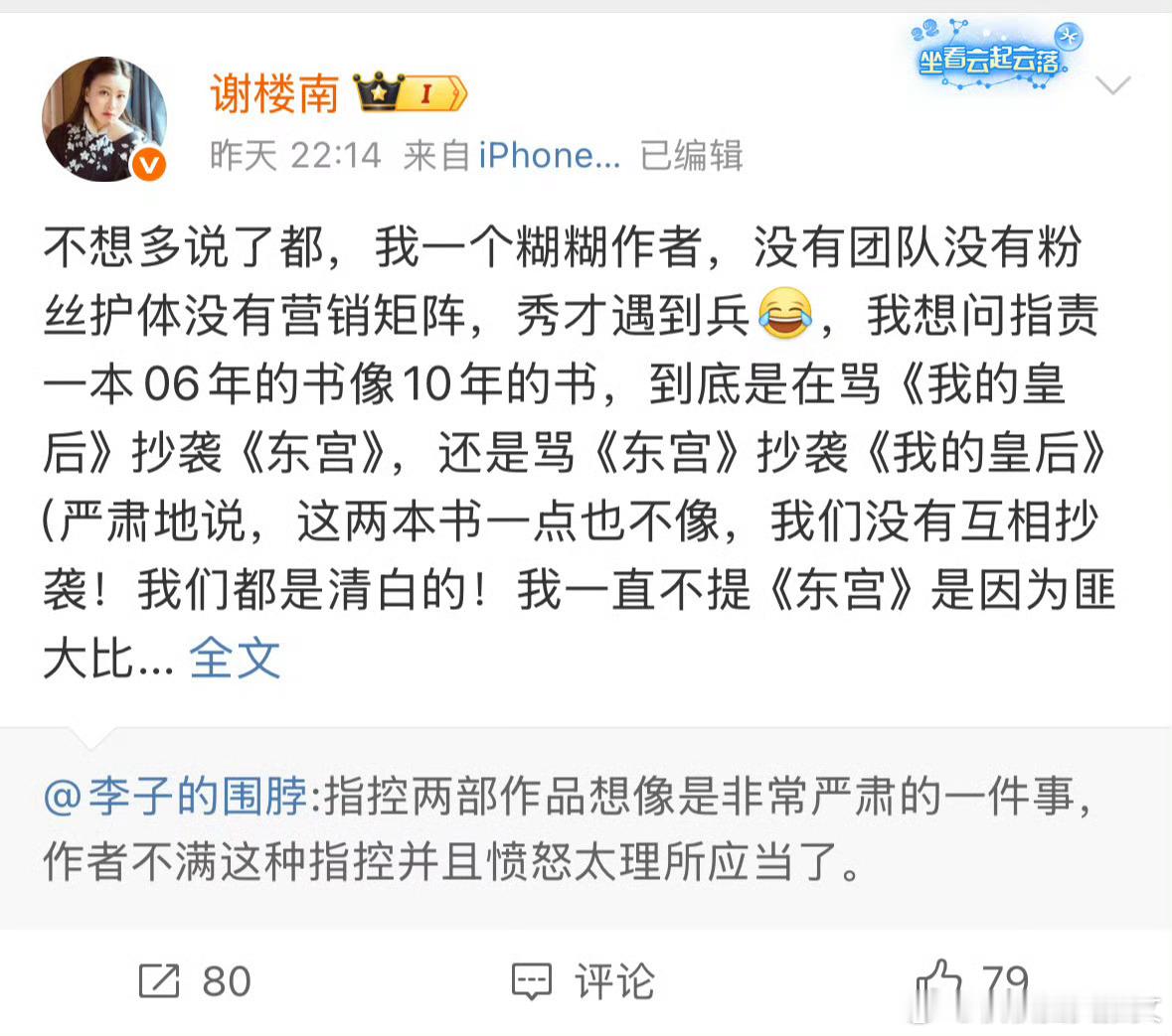 《凤凰台上》原著作者谢楼南发布观剧感想,不满剧改,与剧粉激烈对线。对此,彭小苒也