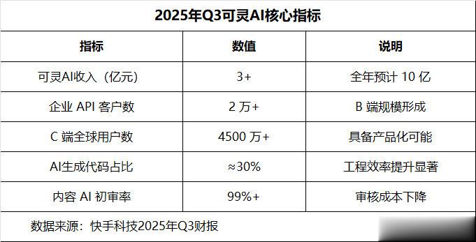 第二是技术驱动变现效率提升。财报显示,快手在广告链路中全面升级了OneRec、G4RL等智能模型,使广告消耗增量达到4-5%;AI生成素材单季消耗金额突破30亿元,广告主使用AI素材的比例持续提升,使转化效率较行业平均水平高出10-20%。