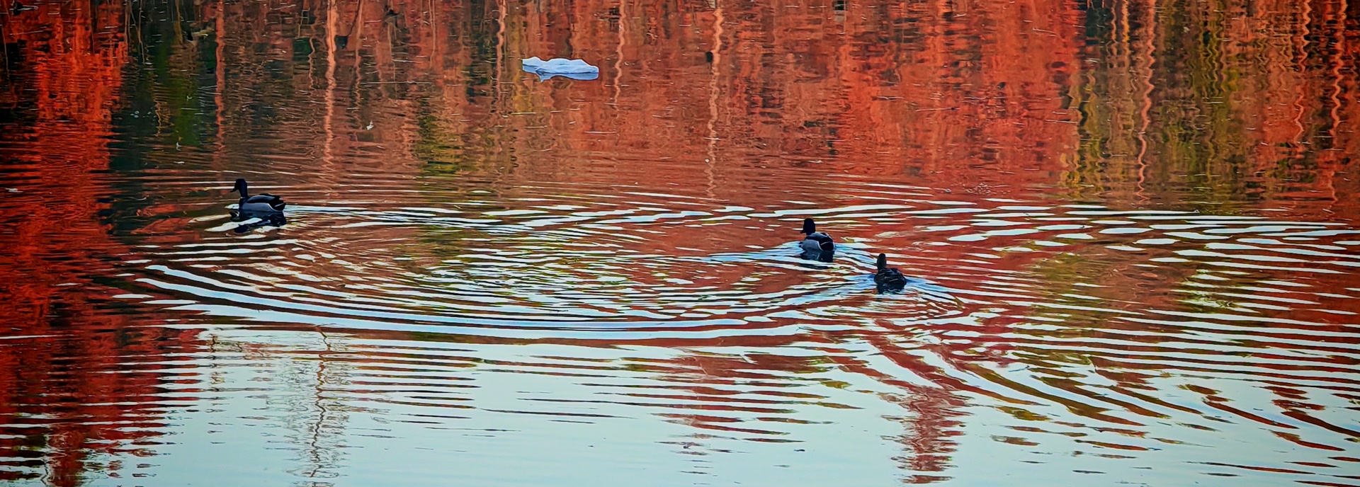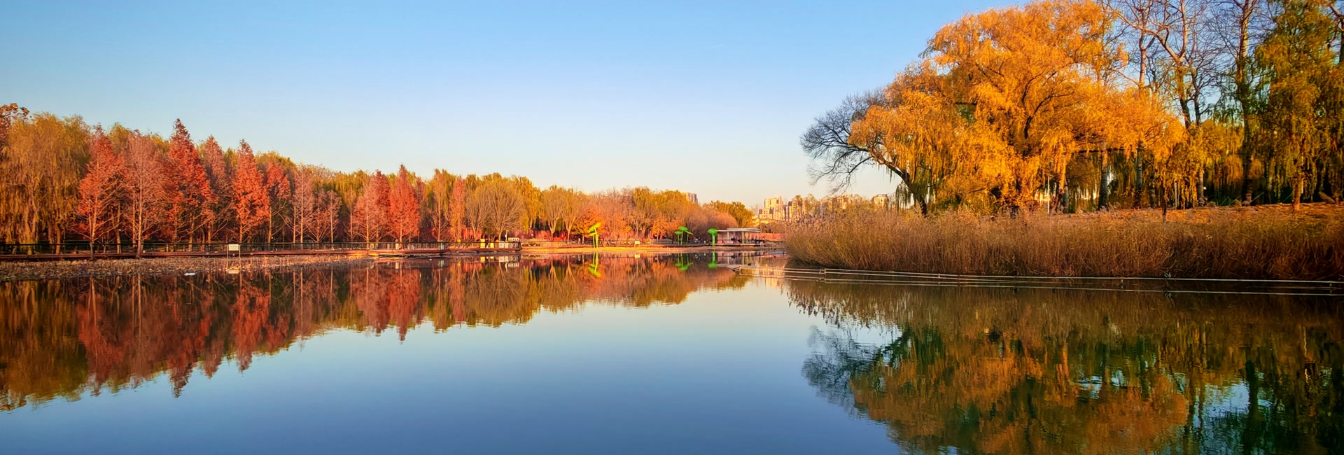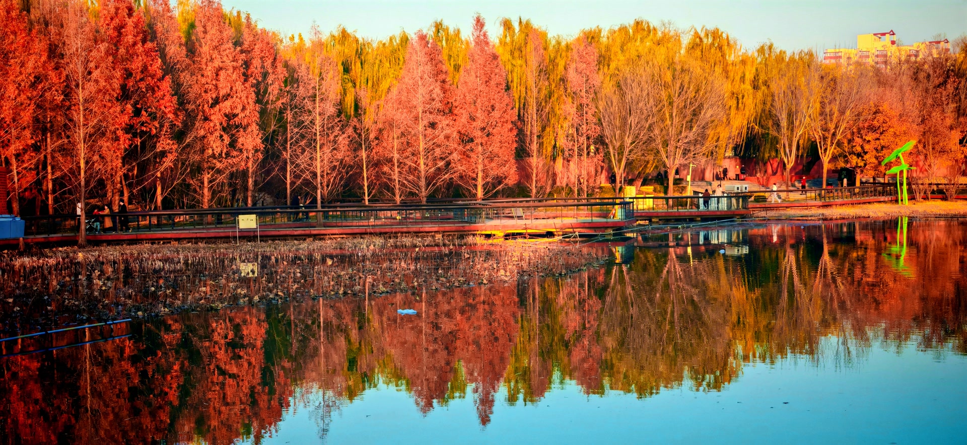 11月22日,小雪时节,北京市朝阳区红领巾公园水杉林一片绯红,将湖面映照得如诗如画,吸引了众多市民前来欣赏打卡。