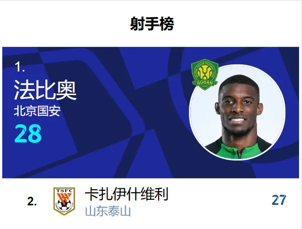 虎扑11月22日讯中超末轮比赛中,北京国安5-1战胜梅州客家,法比奥独揽四球,完成大四喜,卡扎伊什维利在山东泰山5-1战胜武汉三镇的比赛中下半场梅开二度。最终,法比奥末轮比赛逆转射手榜,以赛季28个进球,领先卡扎伊什维利的27球,夺得2025赛季中超金靴。