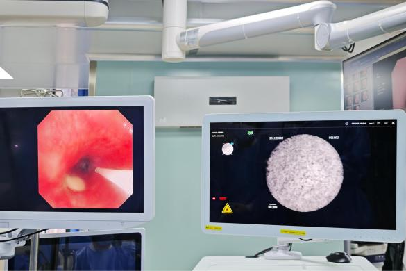 经过多学科讨论,征得患者及其家属同意后,专家团队决定启用“光学活检”的新技术——共聚焦激光显微内镜可视化活检术。术中,专家团队通过激光共聚焦原理,将细胞放大1000倍,对病变组织进行精准取样活检,结合其它检验结果,排除了恶性肿瘤可能,诊断为支气管结核,直接为卢女士实施了气道内冷冻治疗。