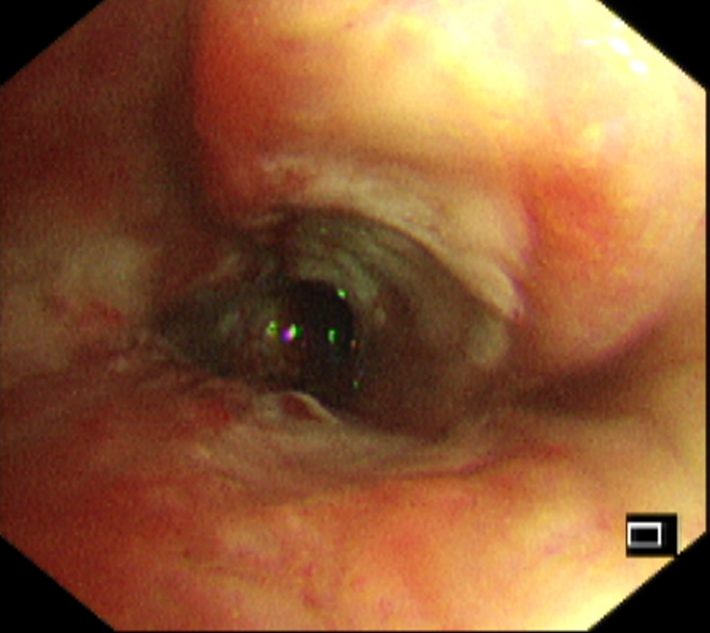 经检查,胸部CT结果显示,卢女士双肺存在多处病变,右中下肺支气管局部已经闭塞;气管镜检查看到,她右下肺的呼吸通道变得狭窄,里面的黏膜又厚又糙,还很红,能看到一些出血点。这种情况下,传统的活检风险较高,可能引发更大出血。