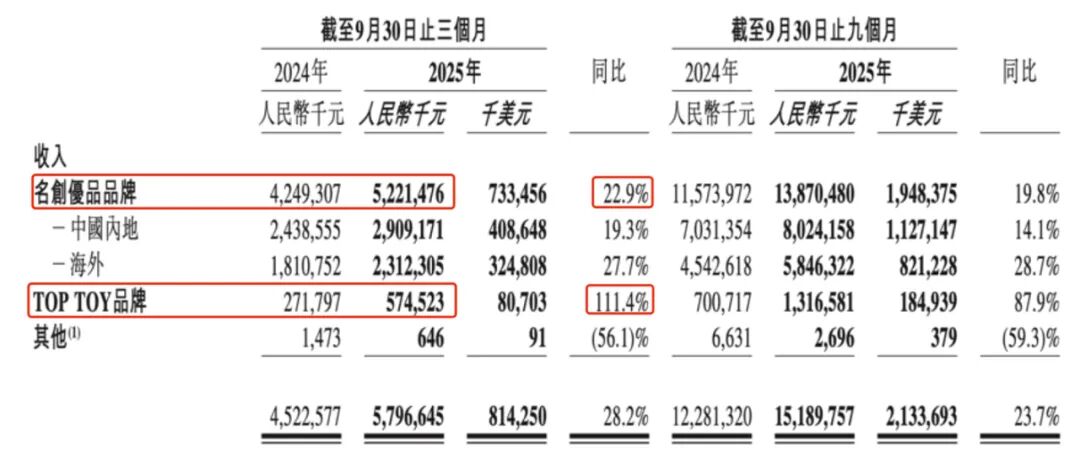 旗下潮玩业务TOPTOYQ3实现收入5.7亿元(注:来自TOPTOY品牌的收入仅指来自外部的收入),同比增长111.4%,今年前三季度收入13.2亿元,同比增长87.9%。