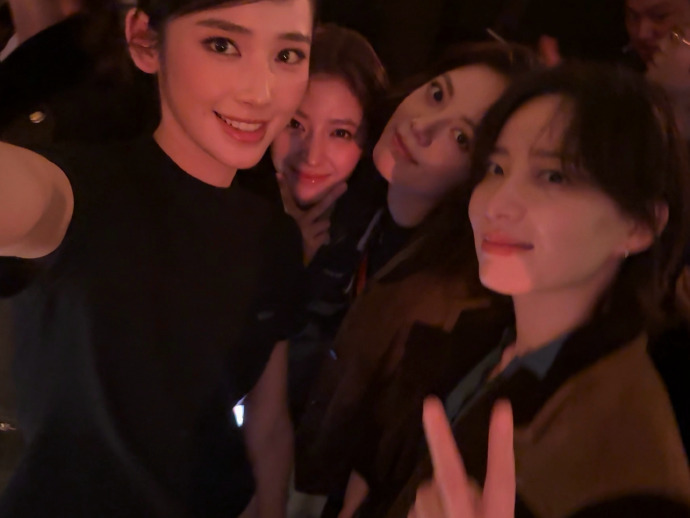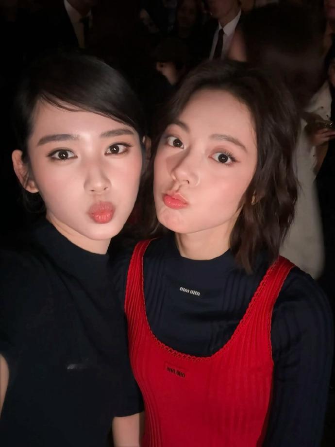 鹤秋分享与赵今麦的 miumiu 同框照,两人造型时尚简约,神态自然大方,同框画