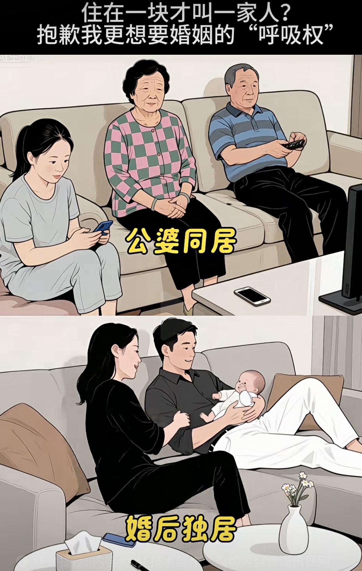 同住=一家人?我搬出去后,老公抱着娃说“这才是家该有的样” 和公婆同住的那一年,我每天都像憋着口气: 吃饭时想夹第三块排骨,手伸到半空又缩回来——怕婆婆说“年轻人吃太多胖”; 下班瘫沙发刷手机,得偷偷躲进卧室锁门——公公会念叨“回家就抱个破手机,眼里没活”; 连抱娃姿势松点,后背都能感受到婆婆的视线“刺”过来。 那天饭桌上,婆婆又对着我碗里的奶茶皱眉:“喝这甜水有啥好?不如给娃煮点米汤。” 老公扒拉着米饭没吭声,我抱着娃的手,指甲都抠进了掌心。 当晚我拖着行李箱出门,刚走到单元楼口,就听见身后脚步声——是老公抱着裹得严严实实的娃,揣着手机说:“咱租隔壁小区的两居,既能天天看爸妈,也能喘口气。” 搬出去的第一顿,我们点了炸鸡配冰奶茶。 老公把最脆的鸡腿皮剥给我,娃在沙发上爬得满身灰,没人催“快擦干净”,没人念“垃圾食品不能吃”。 我咬着炸鸡喝冰饮,甜香裹着凉气滑进喉咙——原来婚姻里的“呼吸权”,是不用看脸色的松弛啊。 老一辈总说“住一起才是一家人”,可“一家人”不该是: • 你熬夜加班,婆婆敲门喊“年轻人不能睡懒觉,起来做早饭”; • 你买支50块的口红,公公在客厅念叨“败家,不如攒钱给娃买奶粉”; • 你和老公拌句嘴,转头全家都围过来“评理”,偏要分出个“谁对谁错”。 现在我们和公婆住隔壁楼: 早上把娃送过去让老人逗一逗,晚上接回来煮碗加蛋的泡面; 周末一起吃顿饭,不用抢着洗碗,吃完各回各家瘫沙发——我窝着追综艺,老公抱着娃拼积木,连空气都是松的。 前几天老公靠在我肩上说:“以前回家像‘打卡上班’,现在一开门闻着你没洗的袜子味,才觉得‘哦,这是到家了’。” 哪有什么“同住才叫一家人”? 舒服的婚姻,是你能瘫着打饱嗝,他能窝着打游戏,娃能满地爬得没规矩——不用谁迁就谁,不用谁委屈谁,这才是家该有的样。 你喜欢[笑哭]是“同住式窒息” 还是“独居式舒服”?