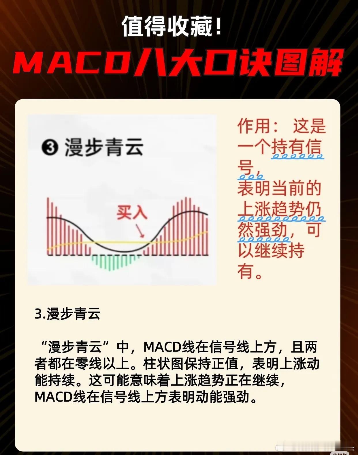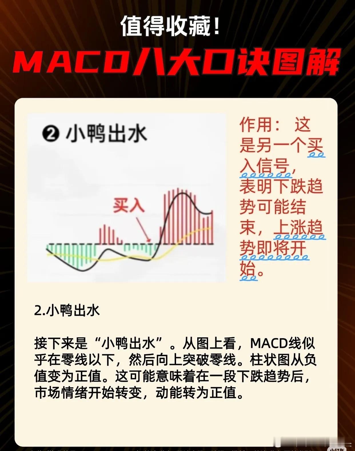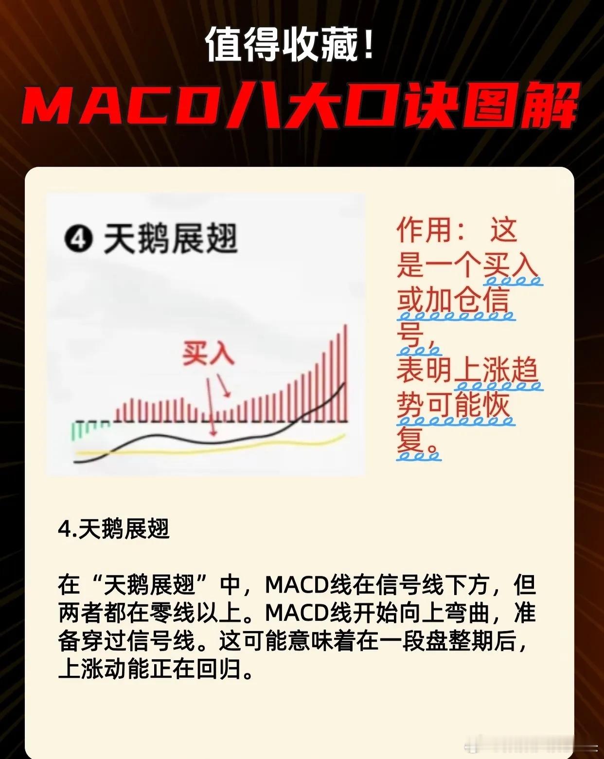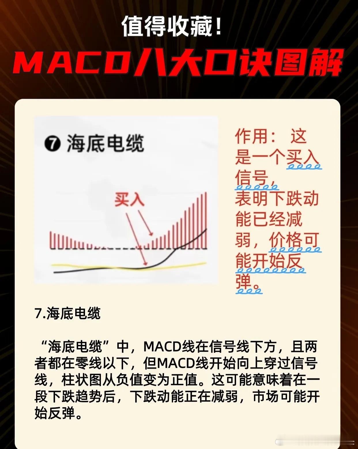 以下是对MACD技术分析教学图的核心内容总结,按形态分类归纳关键信息与操作信号:一、MACD八大口诀图解概览系列标题为「值得收藏!MACD八大口诀图解」,每张图通过MACD指标(含MACD线/信号线/柱状图)的特定形态,明确标注买入/卖出信号,并解释其对应的市场趋势含义。二、八大形态详解与操作信号1. 买入信号类(共6种形态)(1)佛手向上- 特征:MACD线在信号线下方→向上穿过信号线(金叉),柱状图配合。- 作用:明确的买入信号,预示价格可能开始上涨。(2)小鸭出水- 特征:MACD线在零线以下→向上突破零线,柱状图从负值转正值。- 作用:买入信号,表明下跌趋势可能结束,上涨趋势即将启动。(3)漫步青云- 特征:MACD线与信号线均在零线以上,且MACD线在信号线上方;柱状图保持正值。- 作用:持有信号(非严格买入),说明上涨趋势强劲,可继续持仓。(4)天鹅展翅- 特征:MACD线在信号线下方但均在零线以上,MACD线向上弯曲准备穿信号线(即将金叉)。- 作用:买入/加仓信号,预示盘整后上涨动能回归,趋势可能恢复。(5)空中缆绳- 特征:MACD线在信号线上方且均在零线以上,MACD线轻微向下弯曲但未穿信号线,柱状图为正但减少。- 作用:趋势延续信号(非严格买入),动能暂时减弱但趋势仍向上,可继续持有。(6)海底捞月- 特征:MACD线与信号线均在零线以下,MACD线向上弯曲准备穿过零线。- 作用:买入信号,表明盘整后上涨动能回归,价格可能开始上涨。(7)海底电缆- 特征:MACD线与信号线均在零线以下,MACD线向上穿过信号线(金叉),柱状图由负转正。- 作用:买入信号,预示下跌动能减弱,市场可能反弹。2. 卖出信号类(共1种形态)(8)空中缆车- 特征:MACD线与信号线均在零线以上,MACD线向下穿过信号线(死叉),柱状图由正转负。- 作用:卖出信号,表明上涨动能减弱,趋势可能反转向下。三、核心逻辑总结1. 零线是关键分界: - MACD线/信号线在零线以上通常代表多头市场(上涨动能主导);在零线以下代表空头市场(下跌动能主导)。 - 柱状图正值(红)为上涨动能,负值(绿)为下跌动能。2. 金叉/死叉的强化意义: - 金叉(MACD线上穿信号线):在零线以上出现(如漫步青云、空中缆绳)多为强势信号;在零线以下出现(如海底电缆、海底捞月)预示反弹启动。 - 死叉(MACD线下穿信号线):在零线以上出现(如空中缆车)提示趋势可能反转下跌。3. 趋势阶段适配: - 买入信号覆盖“趋势启动初期”(佛手向上、小鸭出水)、“盘整后恢复”(天鹅展翅、海底捞月)、“下跌反弹”(海底电缆); - 卖出信号针对“上涨末期动能衰减”(空中缆车); - 持有信号用于“趋势延续期”(漫步青云)。四、用户使用建议- 收藏参考:系列图解通过直观图表+文字解析,适合快速识别MACD典型形态对应的买卖时机。- 结合其他指标:实际交易中建议配合成交量、K线形态等综合验证信号有效性。- 重点关注零线与交叉:零线位置决定多空基调,金叉/死叉位置决定信号强度。
