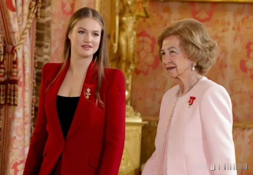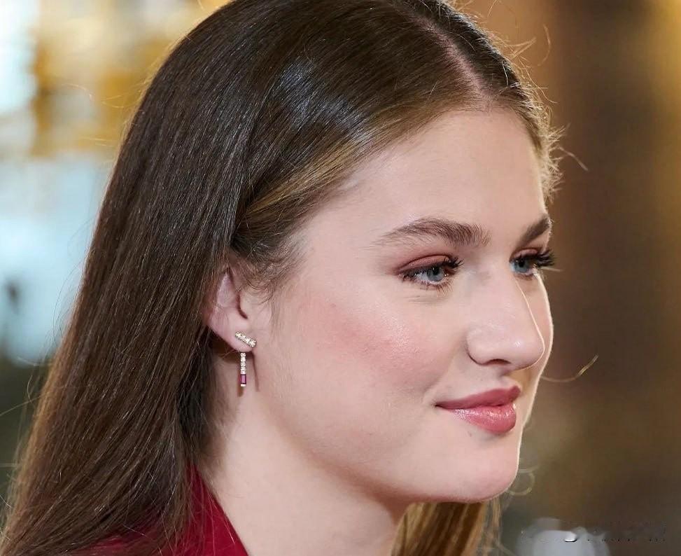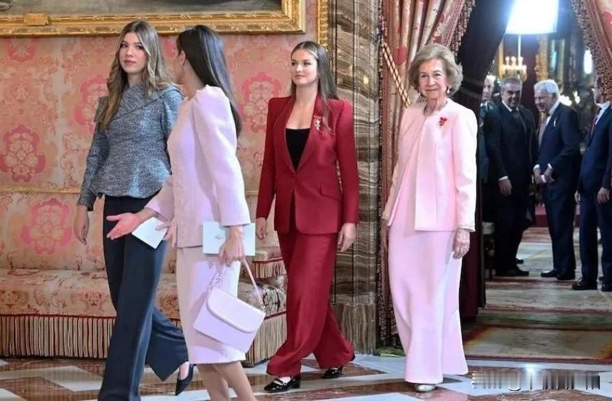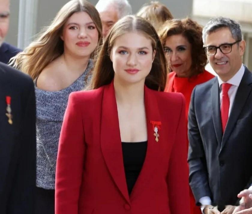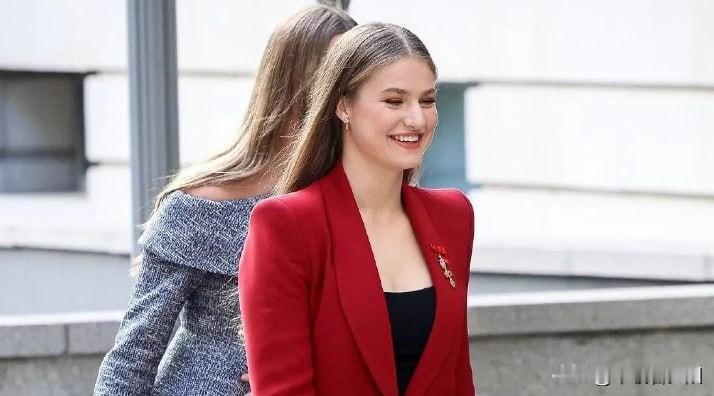 20岁的西班牙王储莱昂诺尔公主,正处于高强度军事训练阶段,除非必要王室活动极少公开亮相。当地时间10月21日,她罕见与家人一同现身马德里皇宫,出席“金羊毛授勋仪式”,再次让外界捕捉到这位未来女王的惊艳状态。 此次亮相,莱昂诺尔以红色西装套装气场全开:挺括西装搭配黑色吊带,既契合王室场合的端庄感,又小露精致事业线,增添轻熟魅力;黑色粗跟鞋衬得身形修长,披散的金色长发柔和了西装的干练,整体造型优雅又灵动。直播无修镜头下,她的颜值依旧抗打——蓝色眼眸清澈深邃,五官大气舒展,贴合唇色的口红衬得气色明艳,完美hold住动态画面。 关注其过往造型会发现,莱昂诺尔偏爱西装套装的选择很用心:既符合王储身份的正式感,又能适配身形,挺括版型修饰线条且不显老气,堪称王室场合“不出错穿搭模板”。她与母亲莱后形成鲜明身形反差:莱后是“行走的衣架”,常年保持紧致体态;而莱昂诺尔与妹妹苏菲亚则是健康饱满的圆润身形,自然体态更添亲和力,让端庄造型多了份柔美感。 外界称她为“天选女王”实至名归:颜值气质在线,王储历练之路也足够踏实,军事训练的投入与王室活动的得体表现,让她兼具实力与辨识度。此次亮相后,西班牙王室民众支持率明显上升,不少网友直言被这位“颜值实力双在线”的未来女王圈粉。