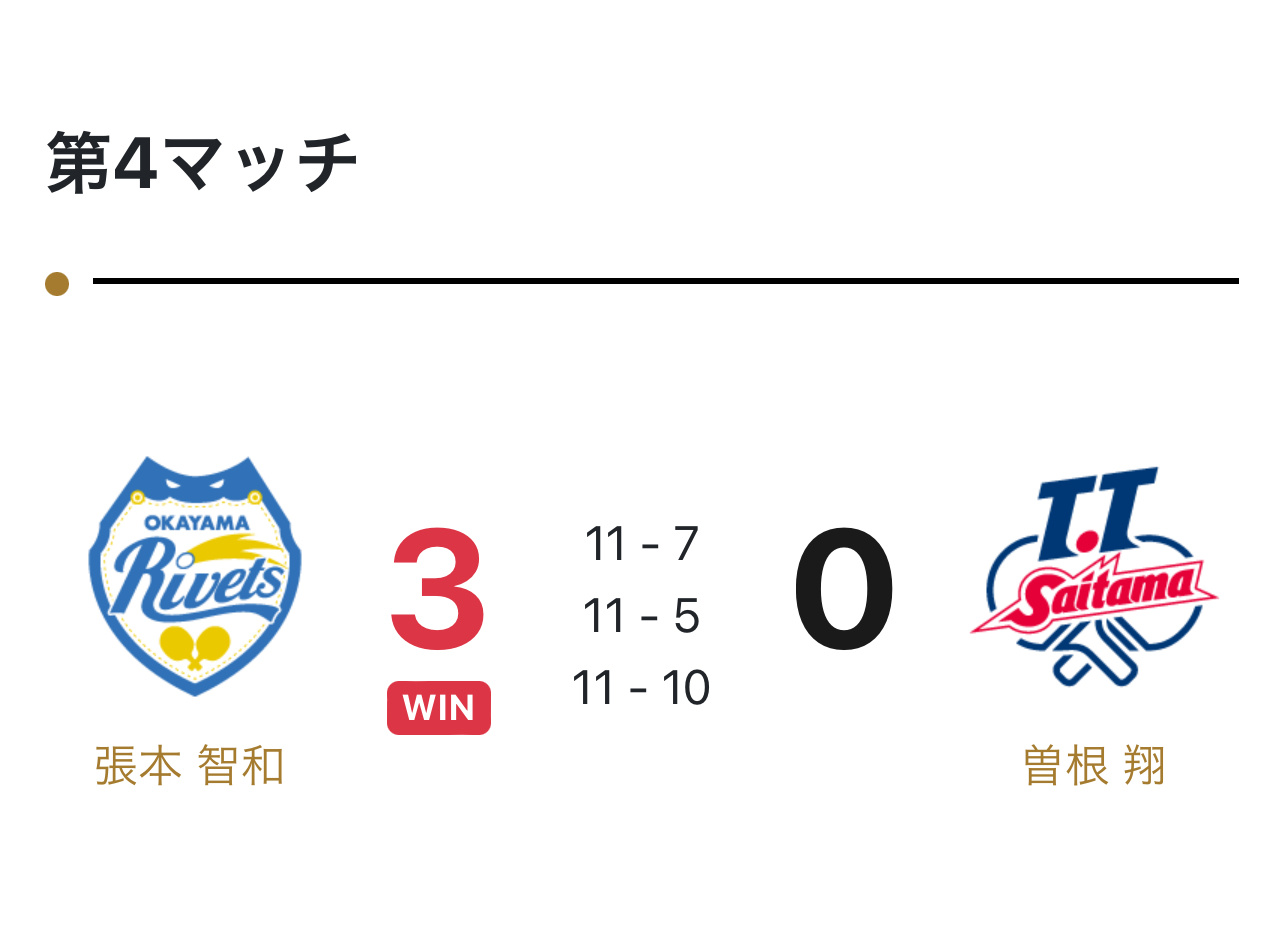 20251122▶️ 岡山リベッツ 3:1 T.T彩たま第一盘: 郝帅/及川瑞基2:1木造勇人/高见真己(4:11,11:7,11:9)第二盘:李尚洙3:1神巧也(6:11,11:6,11:9,11:6)第三盘:郝帅1:3有延大梦(11:8,6:11,10:11,5:11)第四盘:张本智和3:0曾根翔(11:7,11:5,11:10)恭喜冈山获得赛季第7胜🎉