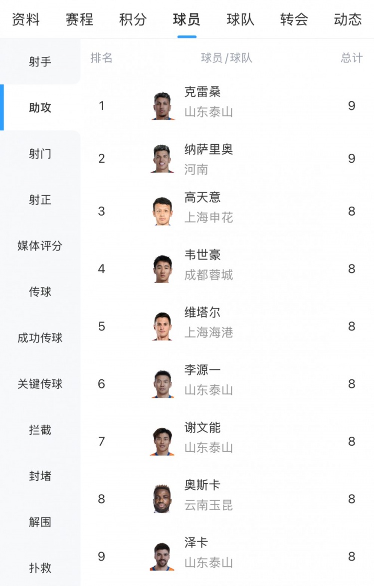 直播吧11月22日讯2025年赛季中超联赛落下帷幕,在助攻榜方面,克雷桑和纳萨里奥9次并列第一。