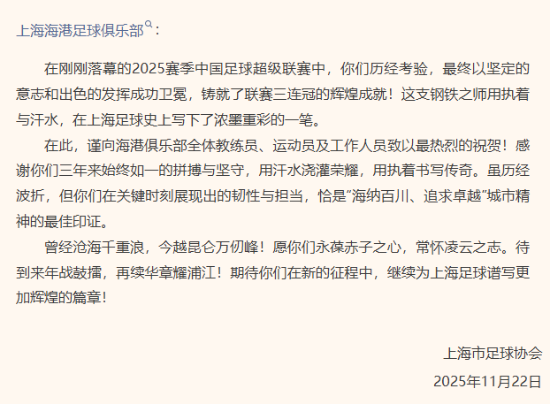 虎扑11月22日讯2025赛季中超落下帷幕,上海海港连续三个赛季夺得中超冠军。随后,上海市足协发贺函祝贺,内容如下: