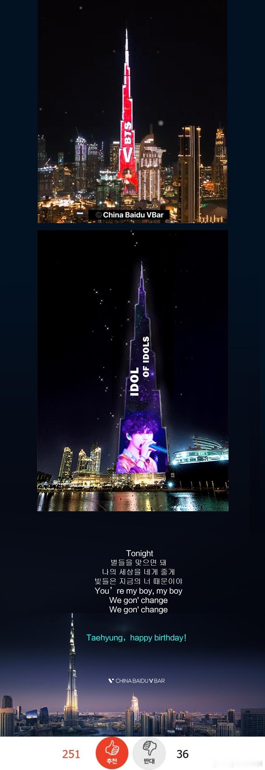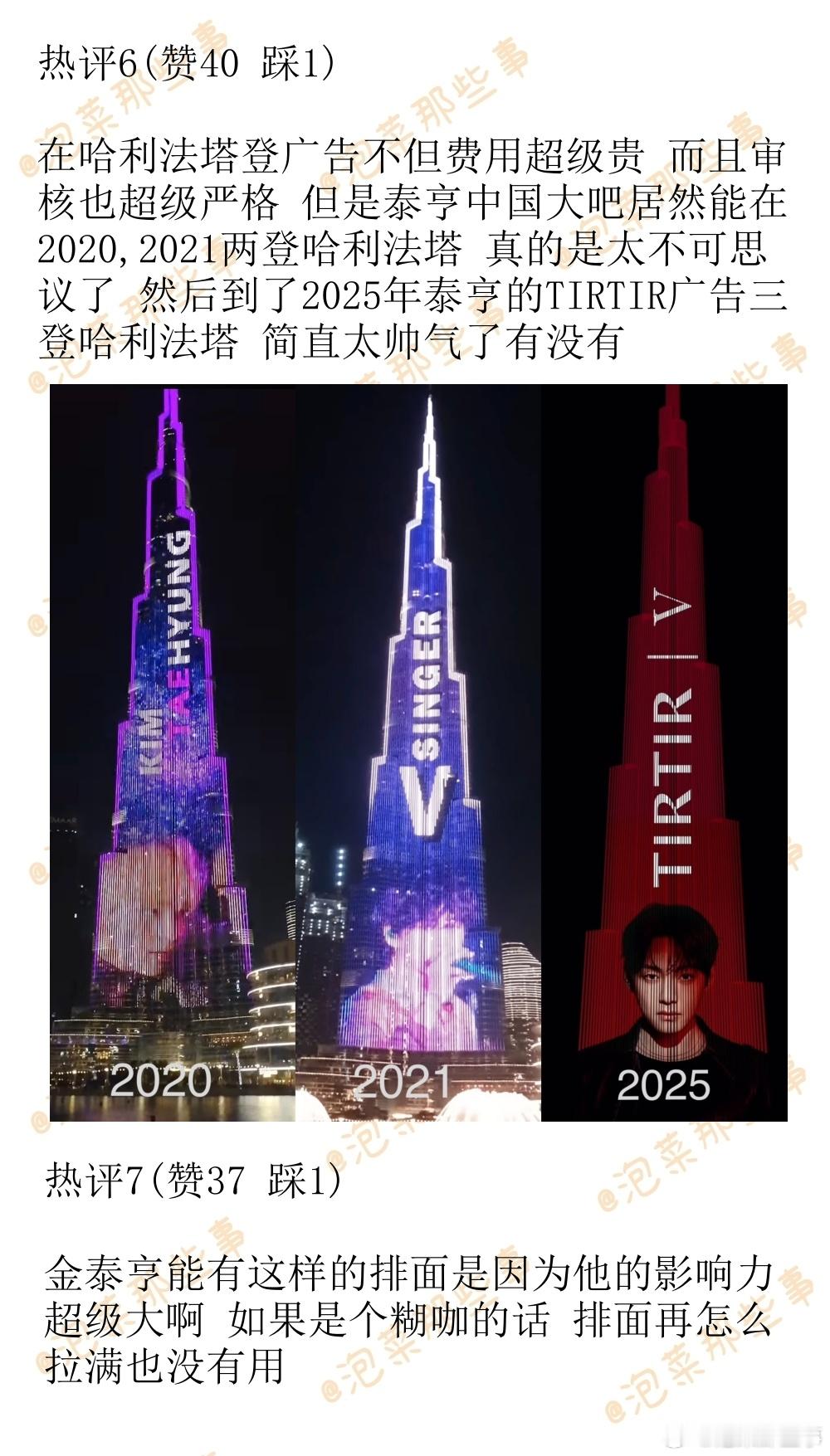 🔥韩网热帖评论翻译🔥BTS金泰亨代言的TIRTIR广告登上迪拜哈利法塔韩网原帖帖主称:金泰亨代言的TIRTIR广告登上了迪拜哈利法塔 中国金泰亨大吧曾经于20、21连续两年在哈利法塔投放应援庆祝金泰亨的生日 哈利法塔此前仅接受跨国品牌或王室广告 金泰亨的生日应援开创了先例 所以这已经是金泰亨第三次登上哈利法塔了 排面太牛了简直 ㅋㅋㅋㅋㅋㅋㅋㅋcr.pann