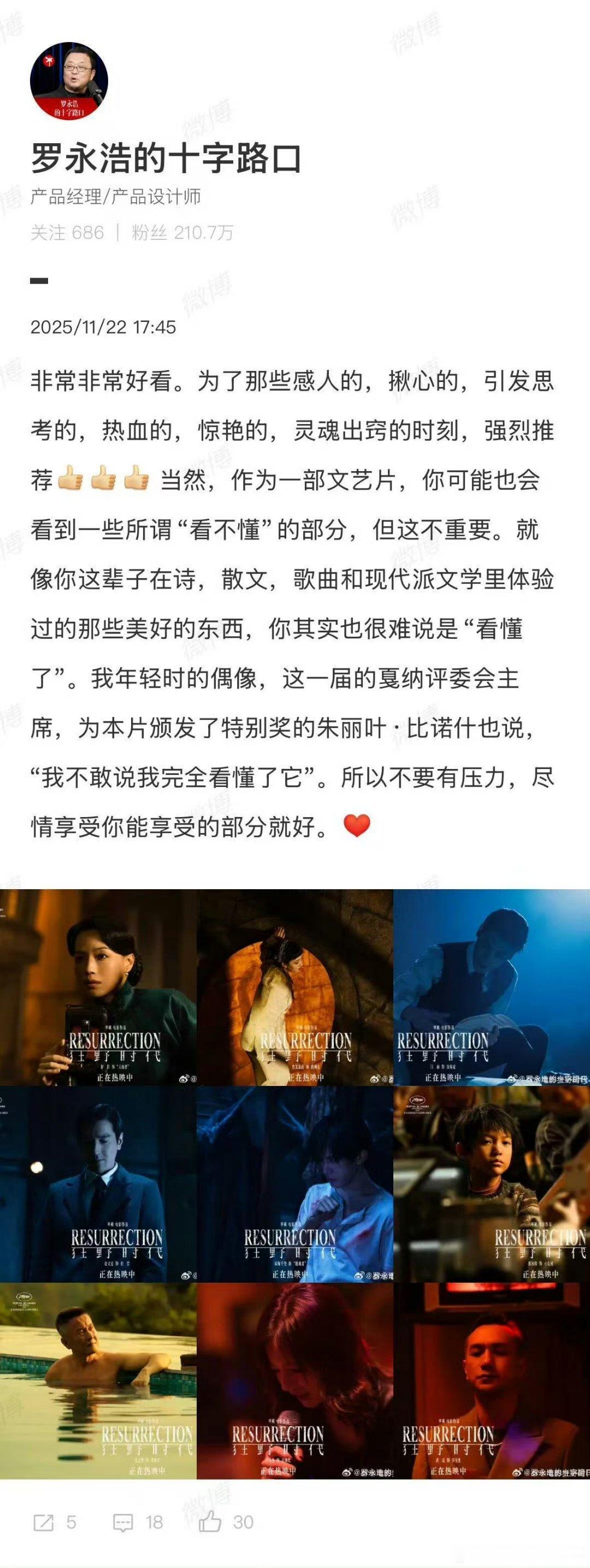 老罗这话太对了!《狂野时代》的美本来就不需要完全看懂,就像听一首好歌未必听懂每句词,但不妨碍浑身起鸡皮疙瘩!