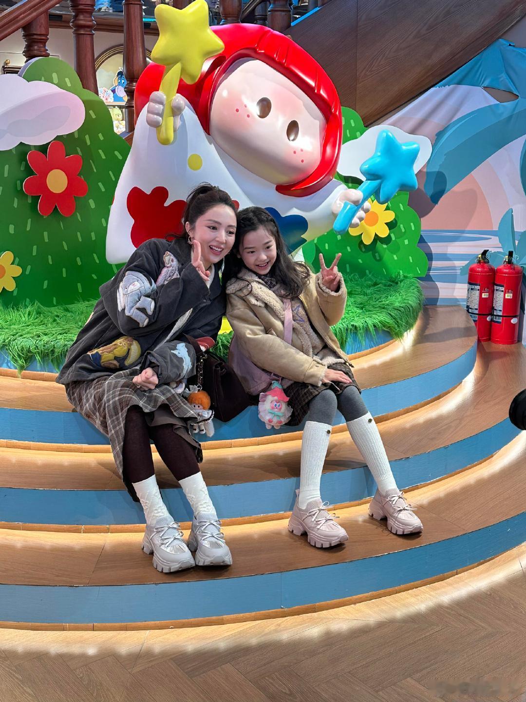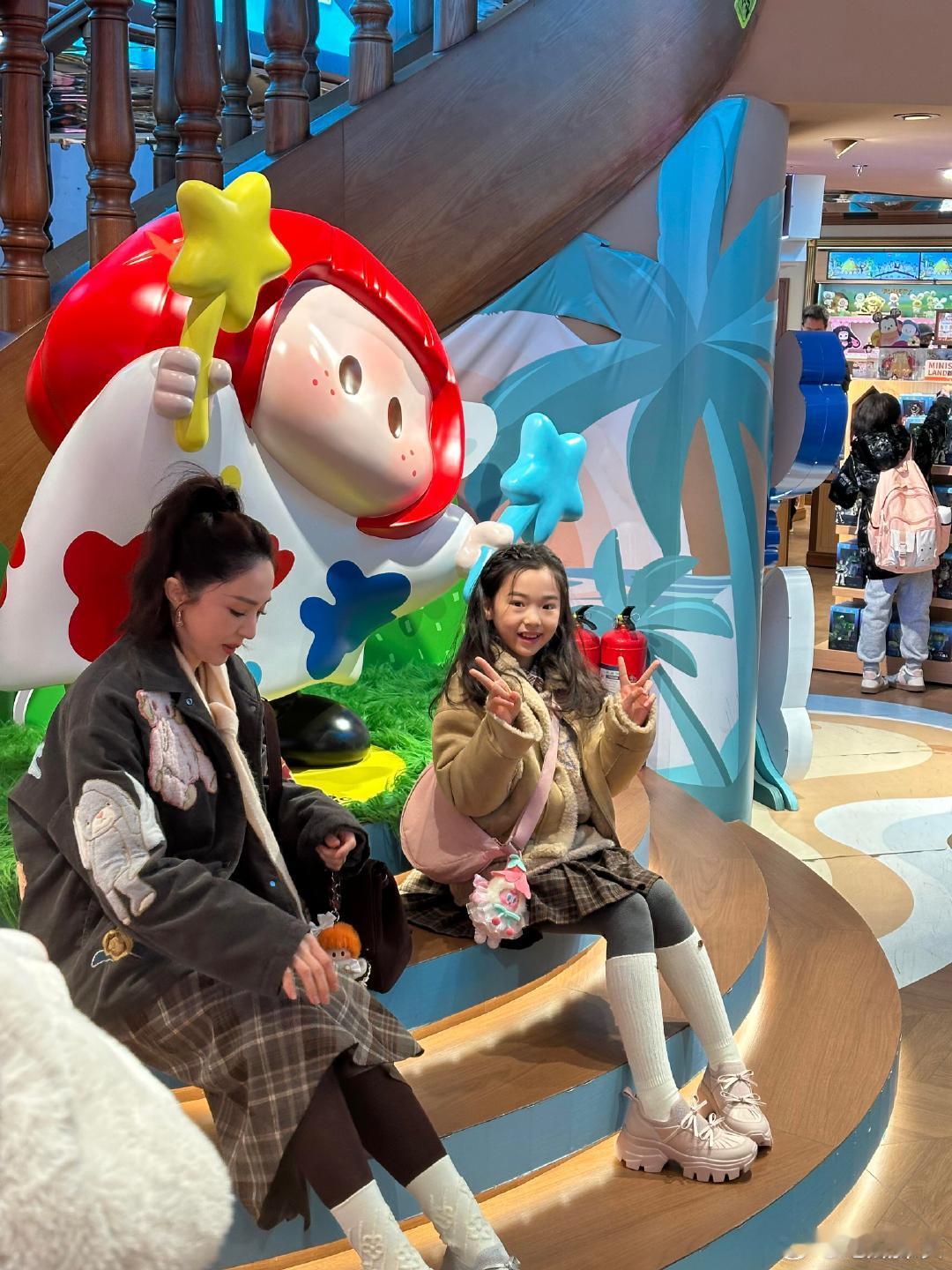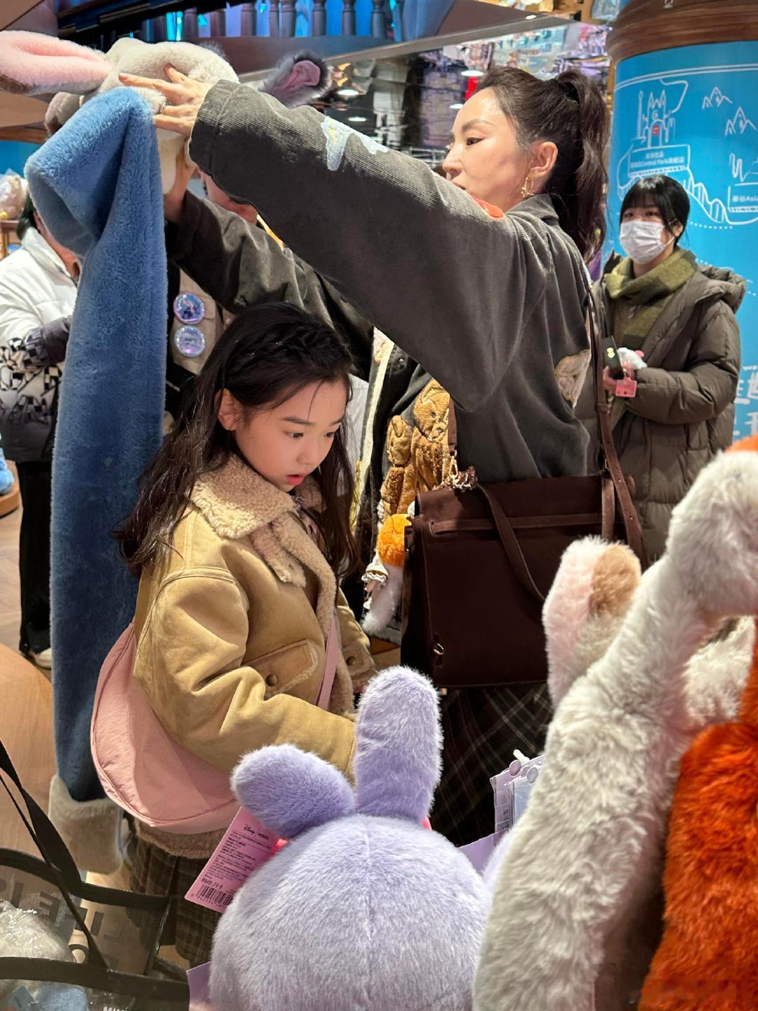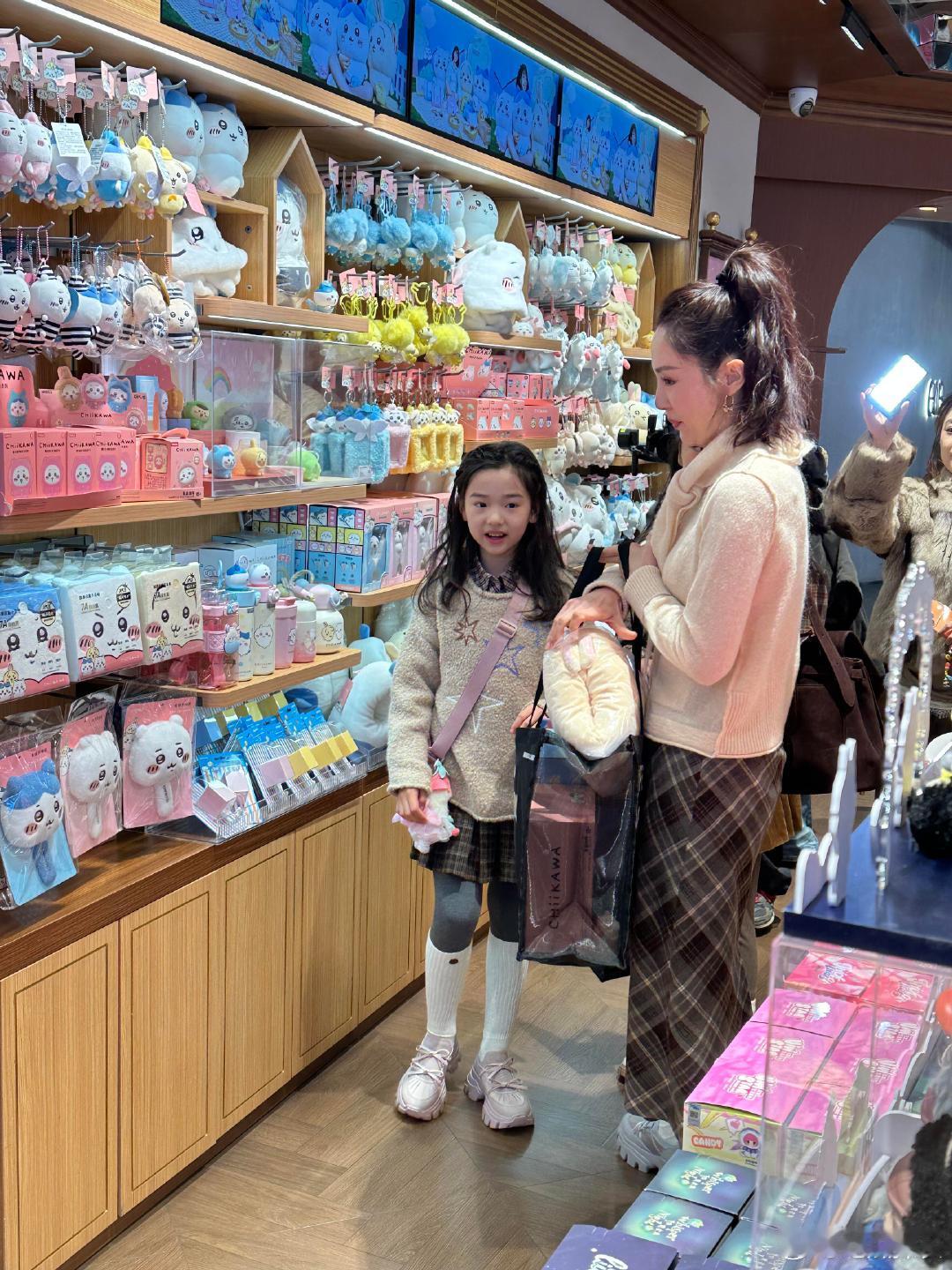 小酒窝穿了格子裙配长袜,在店里拿着个盲盒晃来晃去,董璇在旁边帮她挑款式,还顺手拿
