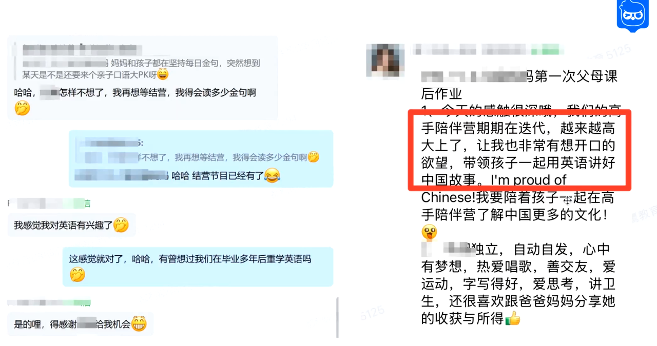 在父母课的带动下,许多家长开始主动参与英语学习。有的和孩子一同打卡扶小鹰英语分级阅读,有的尝试用英语讲述中国故事,还有的与孩子约定“亲子口语大PK”。