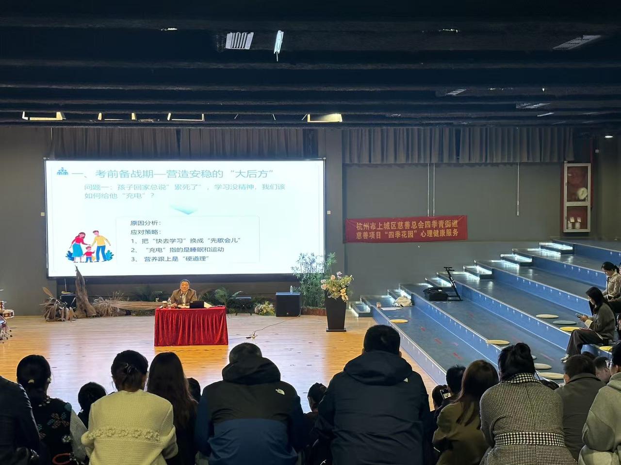 杭州市钱江外国语实验学校的初三家长会上,家庭教育、心理专家给家长们开展讲座学校供图
