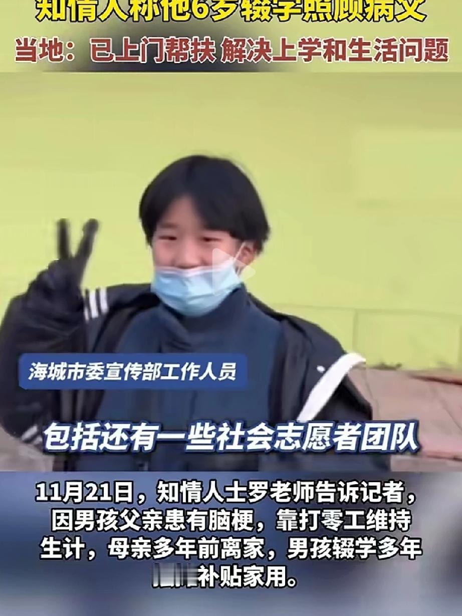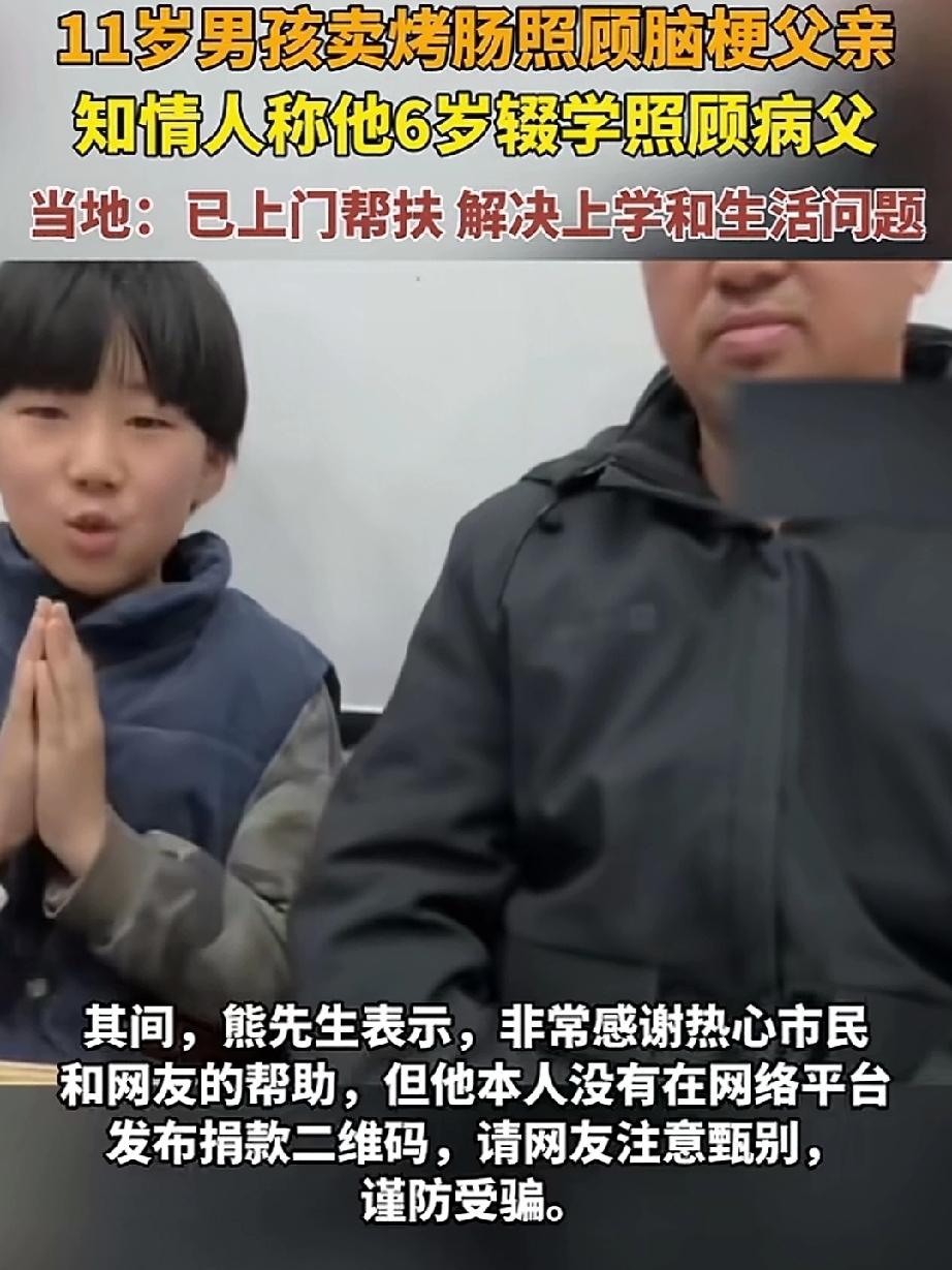11岁男孩卖烤肠来照顾脑梗爸爸,据知情人说男子6岁时就辍学照顾生病的爸爸,妈妈早就离家出走! 父子二人相依为命,男孩本该坐在教室读书,小小年纪就扛起家中的重担,从6岁到11岁这几年不知怎么过来的,做饭洗衣扫地,一切家务都落在孩子肩上,主要还得赚钱养活爸爸,一个这么小的孩子,在外摆摊得多难,如果妈妈不走,该多好,可怜了孩子! 幸运的是,当地有关部门得知后,上学与生活问题已解决!感谢这些好心人对父子二人的帮助!