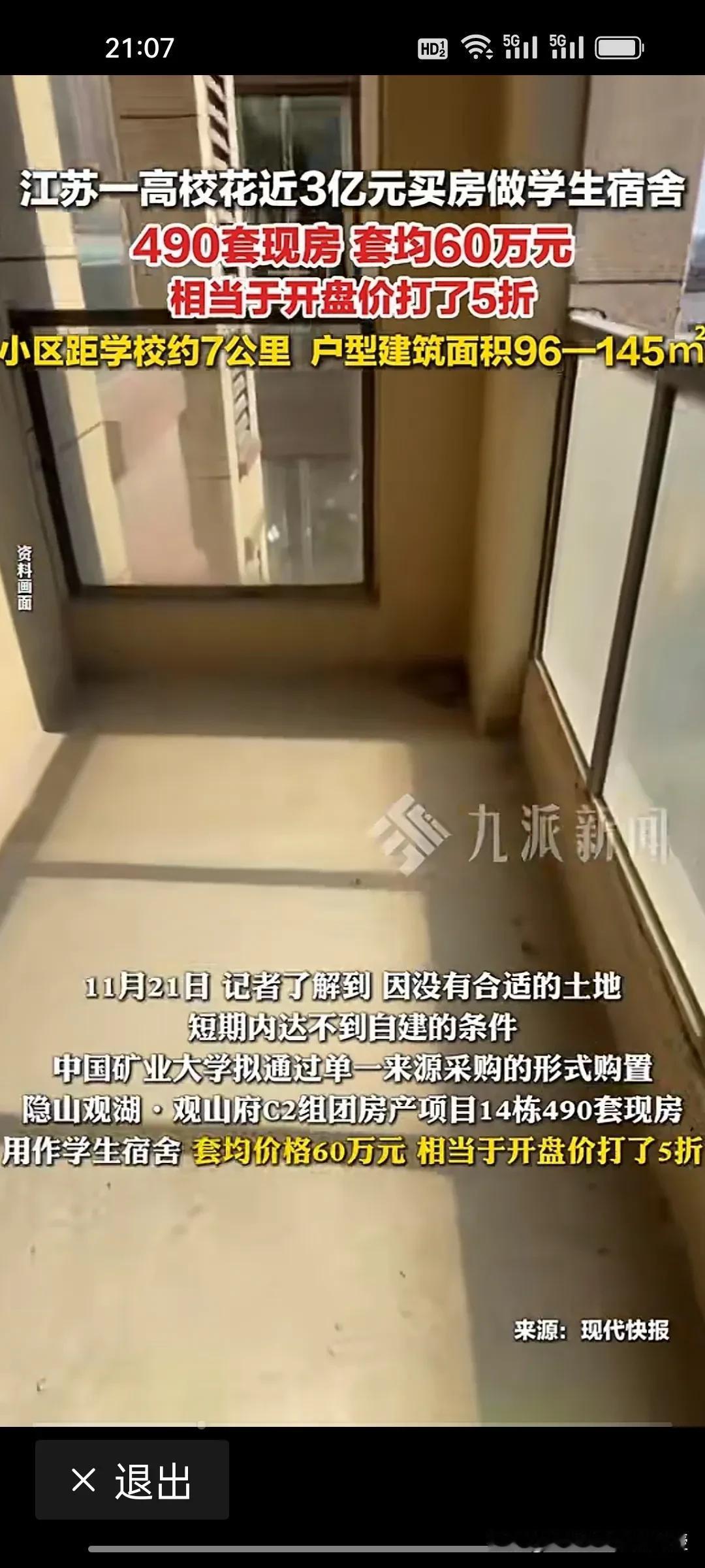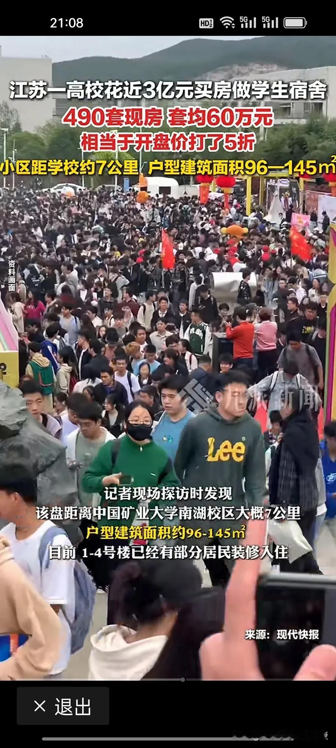 这确实是多了一个房地产去库存的好方法!中国矿业大学南湖校区要用2.9亿元买490套现房给学生做宿舍,套均60万。批量买房按现价打了五折。户型96平到145平,学生们直呼住宿条件大大提高。 此举帮助了当地房地产公司去库存,还解决了学生宿舍的问题,真的是一举两得。之前已经有湖北大学,中南大学等高校均斥资买楼给学生做宿舍,这也确实是比自建宿舍省太多钱了。