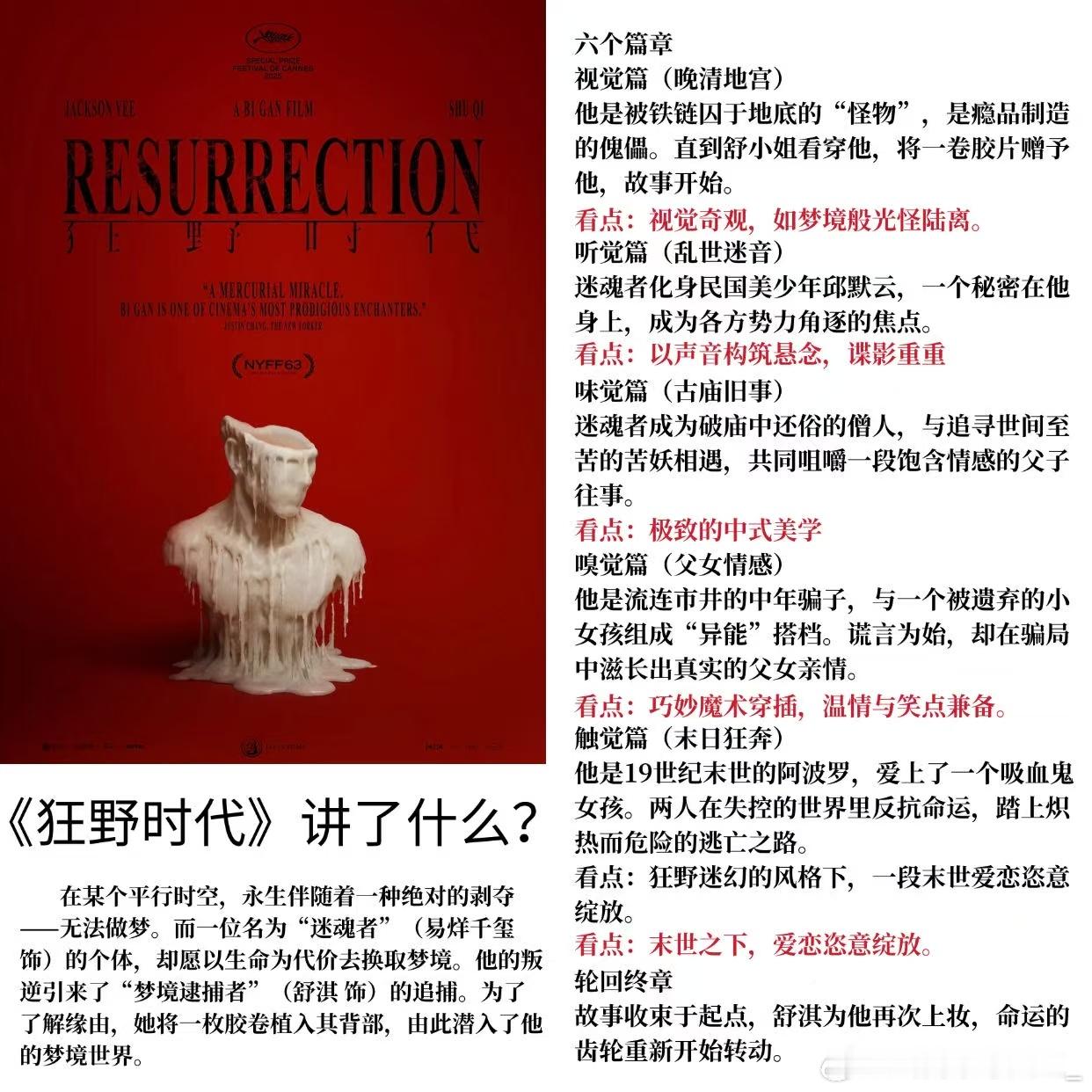 这个《狂野时代》带着知识点就往我脑子里钻啊,从这部电影里能学到的也太多了吧!开场的默片,视觉上感觉到了一种对德国表现主义风格的致敬。小怪物上演的《水浇园丁》,在影史中被书写为第一部剧情片,如此🐮的电影史知识就狂野的奔涌进我的脑子!音乐上出现的特雷门琴,这把琴独特又新奇,就连演奏者少之又少~~整个片子从五感这个大的概念来看,就知道其实蕴含着很多哲思,苦妖篇章的中式哲思点醒了我!甘与苦的概念,不管怎么解读,都是很有意味。美则美矣还有灵魂,这就是《狂野时代》的含金量!对狂野观众来说是真的学完这个学这个,学完这个学那个了吧