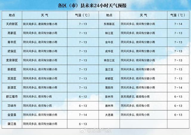 成都市气象台发布最新天气预报,预计未来三天我市以阴天间多云天气为主,云层是常驻嘉宾,今夜有分散小雨来打卡,气温在6-14℃之间波动。另外,24日有4-6级的偏北风上线,随后多云间阴轮换场,最低温跌至4℃。近期早晚温差大,建议大家秋裤、防风外套都别落下!风天易凉,保暖要狠狠拿捏住~~