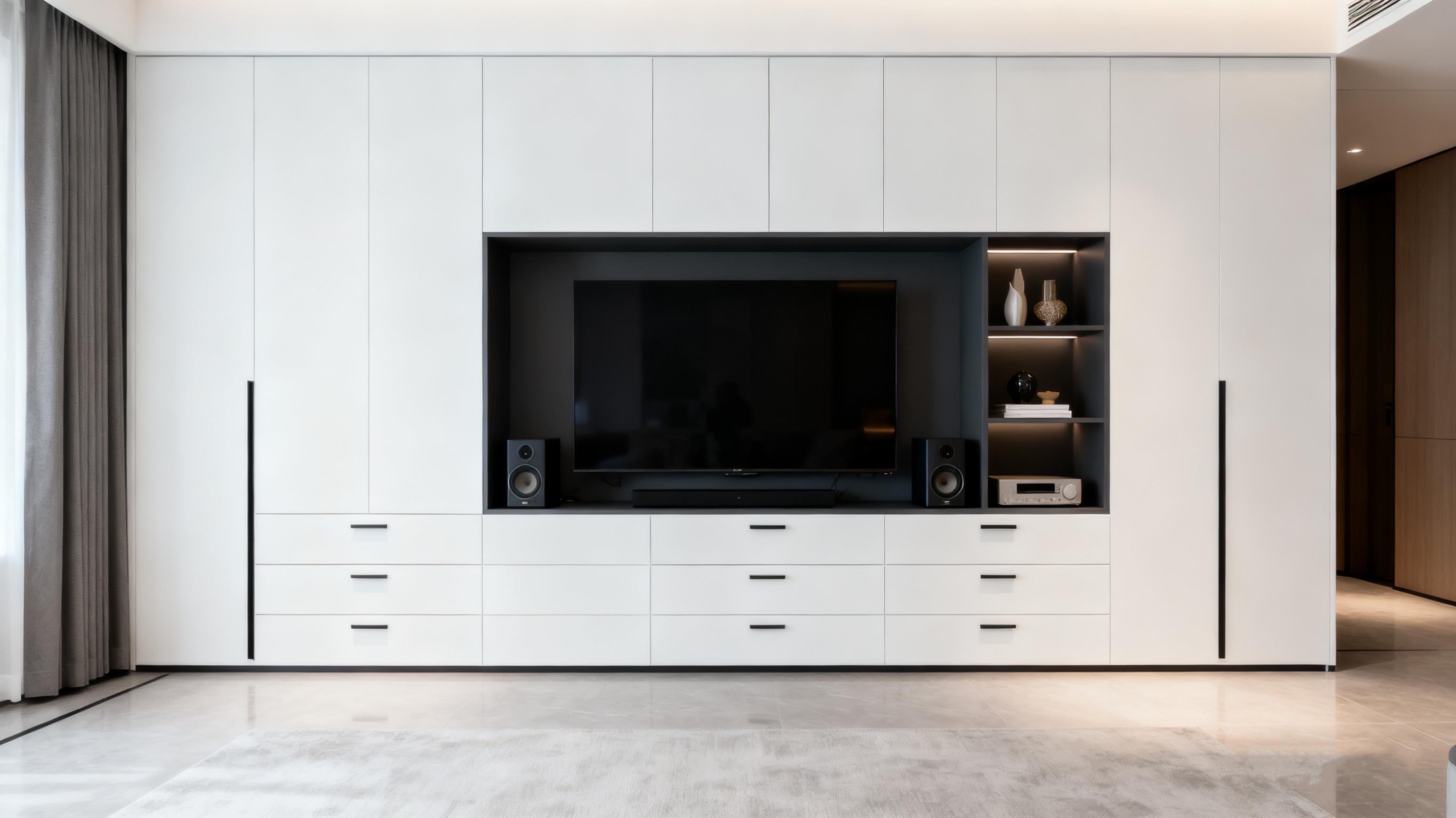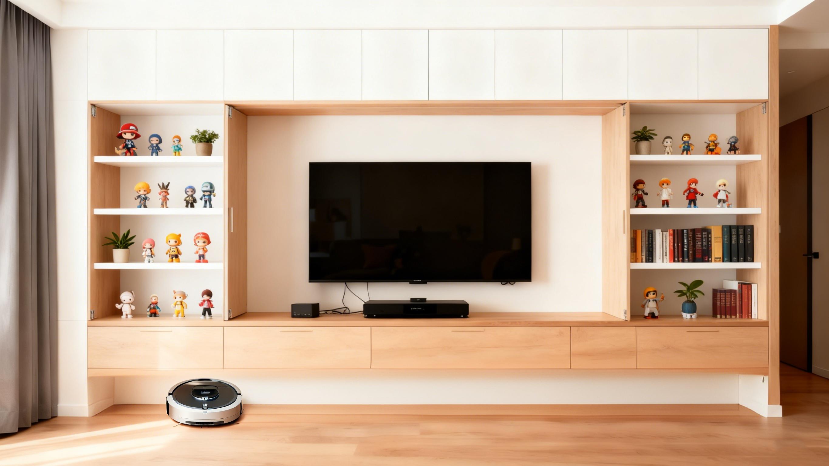 3.定制电视柜局部留空:电视柜别做满墙封闭柜,底部留空10-15厘米,放扫地机器人;在中间做开放格,用于电视机的安装;在两侧设计开放格,用于摆放路由器、机顶盒、游戏机以及装饰品、书籍。功能与美观并存,且方便操作。