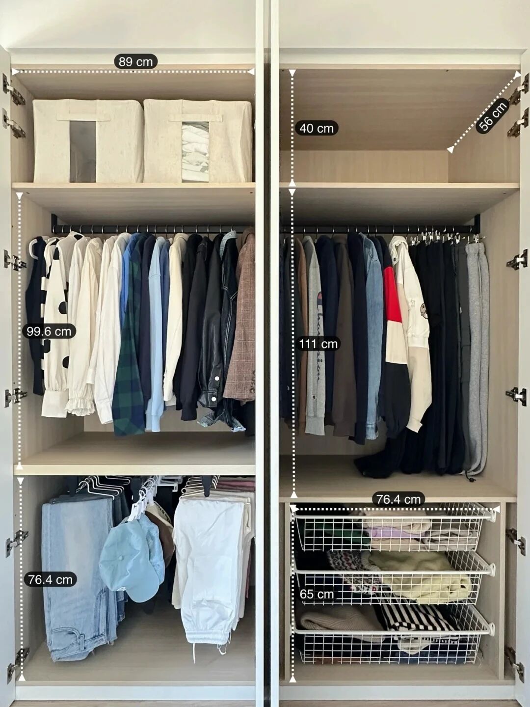 多做挂衣区,把衣服挂起来,不仅方便查找和取放,还能避免褶皱。再根据男女衣物分区、长短衣分区,还能进一步榨干每一寸空间。
