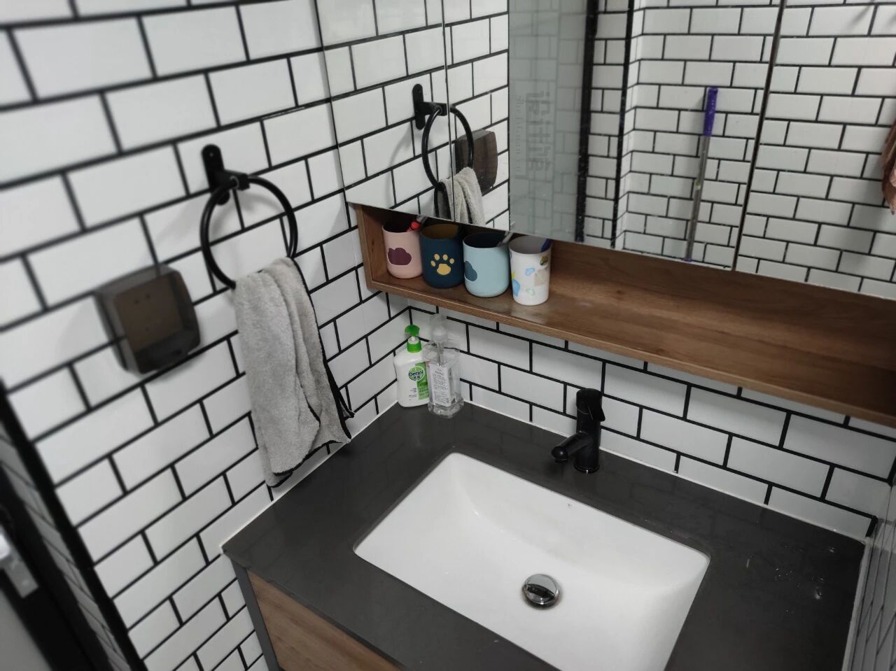 6.浴室柜做留空:浴室柜底部留空,可以把洗脸盆、澡盆塞进去;镜柜中间留空,可以放刷牙水杯与牙刷,保持洗手台整洁。