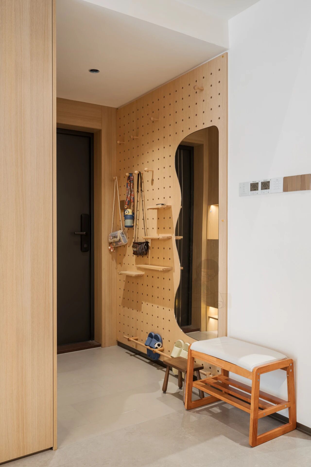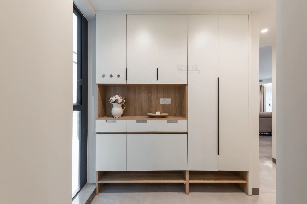 1.定制鞋柜底部留空:鞋柜离地的15-20公分做悬空区,专门收纳常穿的鞋子和拖鞋。早上出门不用蹲下来翻找鞋子,回家脱下的鞋子也能直接踢进悬空区,玄关地面再也不用堆满鞋,玄关瞬间整洁了。