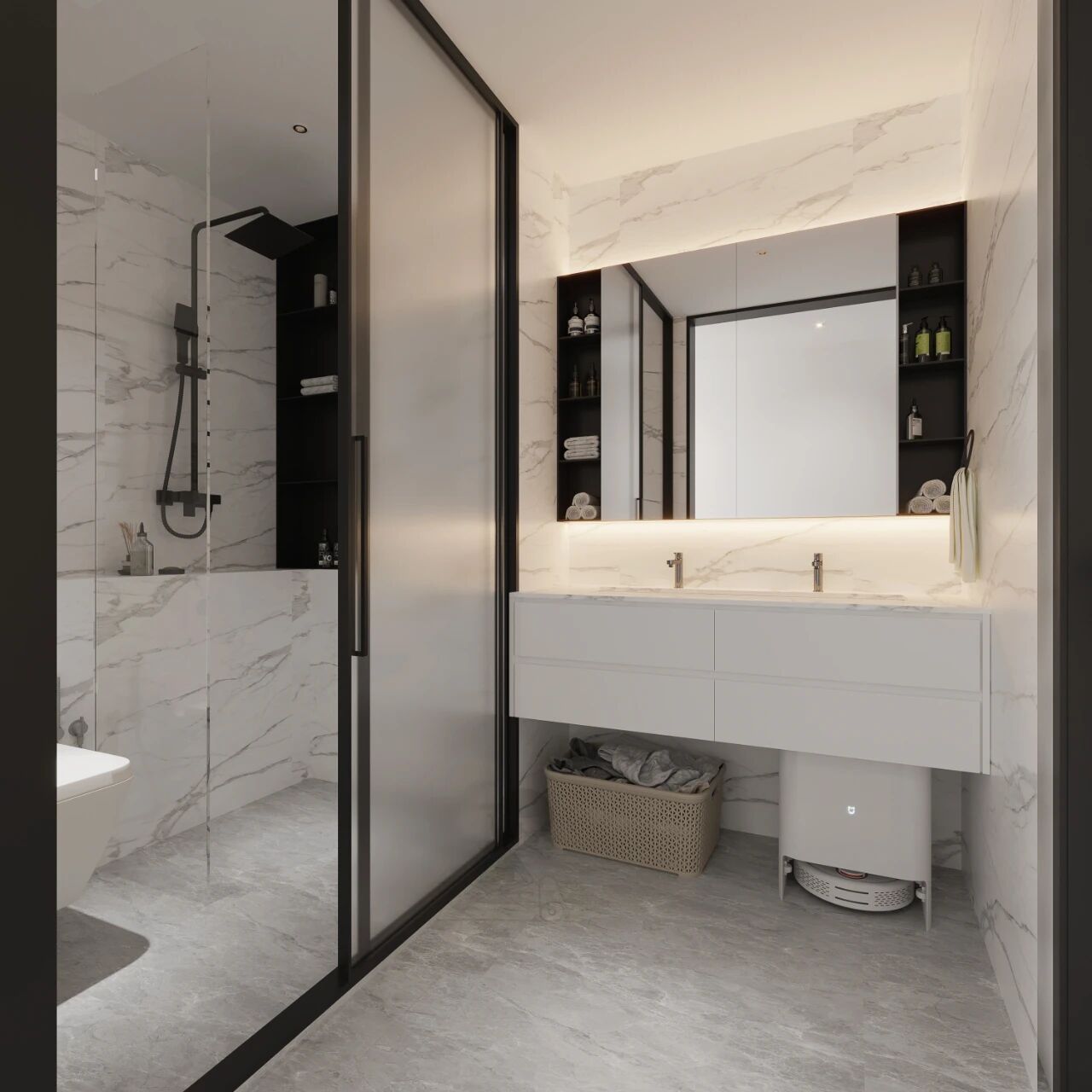 3.卫生间镜柜:浴室柜≠只放化妆品,在浴室柜里,应为吹风机、卷发棒预留带电源的收纳格;在镜柜里,牙膏、牙刷、这些每日必用物品,应放在最顺手的第一层,而不是高悬在柜子顶部。