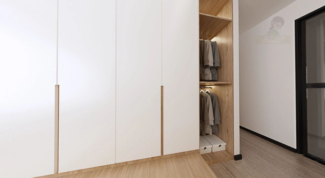 4.定制衣柜做留空:衣柜做一个开放挂衣区,作为次净衣区,挂放穿过但还不洗的衣服。床尾与飘窗就不用堆满衣服显得脏乱了。