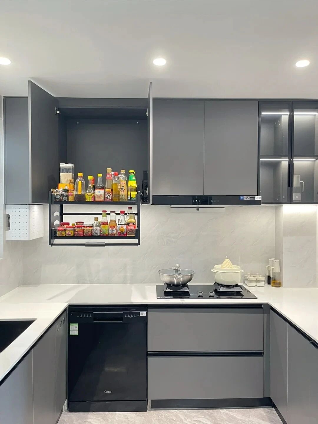 通过碗碟拉篮、调味品拉篮、锅具拉篮,能让你轻松取放最里侧的物品,甚至还可以用高柜联动拉篮、转角飞碟拉篮,完美解决那些难以利用的尴尬角落。