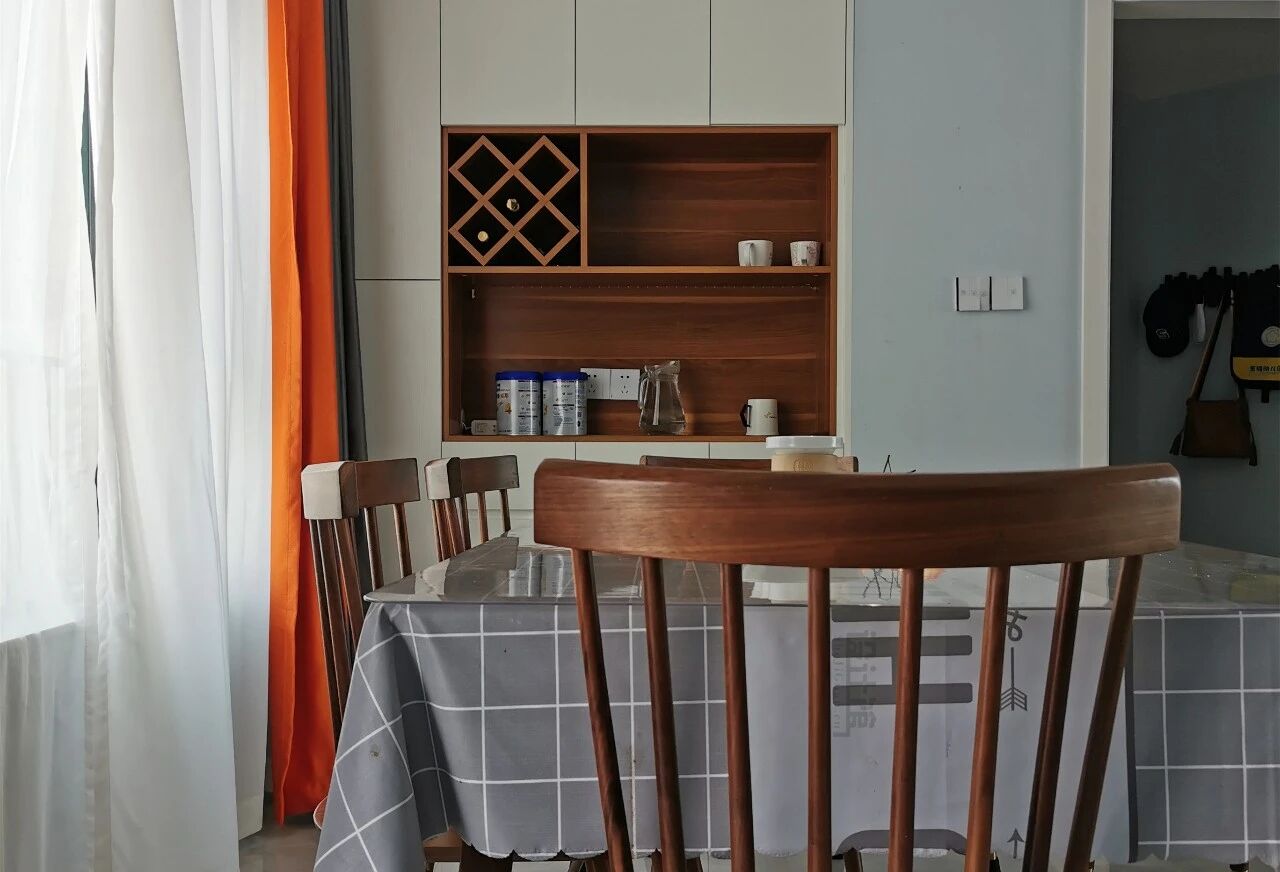 2.定制餐边柜中间留空:餐边柜中间留空40-60厘米(高度在80-150厘米之间,方便拿取),这个开放格可用作放常用的杯子、纸巾、零食,餐桌台面被彻底解放,空间感也就没那么容易乱了。
