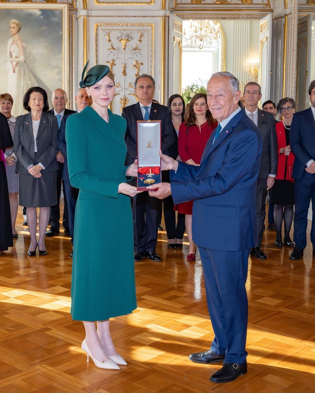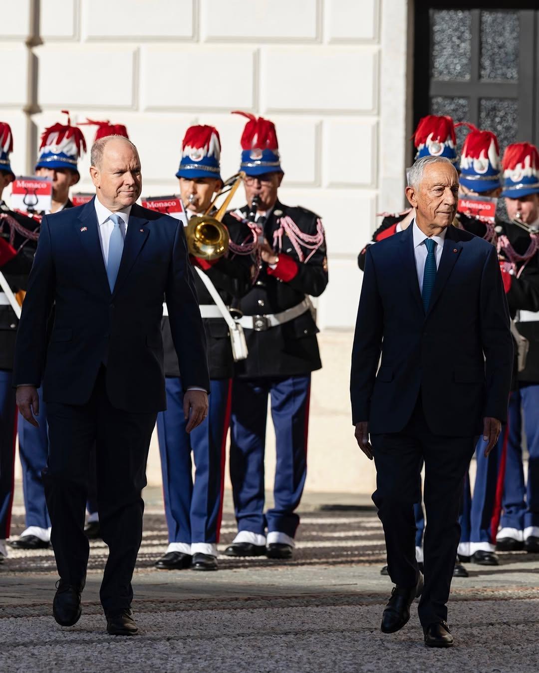 11月21日,摩纳哥亲王阿尔贝二世和王妃夏琳接待来访的葡萄牙总统马塞洛·雷贝洛·德索萨 摩纳哥因为地太小(就2平方公里),一般很少接待外访,而资料显示葡萄牙总统甚至从未访问过摩纳哥 过门是客,为了隆而重之,摩纳哥为总统大爷准备了全套接待仪式 另外在王宫内部,提级按照国事访问的礼仪相互交换勋章:阿尔贝二世亲王向雷贝洛总统授予圣卡洛斯勋章大十字勋章。同时,葡萄牙总统向摩纳哥君主赠送基督勋章大项链,并向夏琳王妃授予基督勋章大十字勋章 随后还出门溜达了下,夏琳绿裙子来自Emilia Wickstead