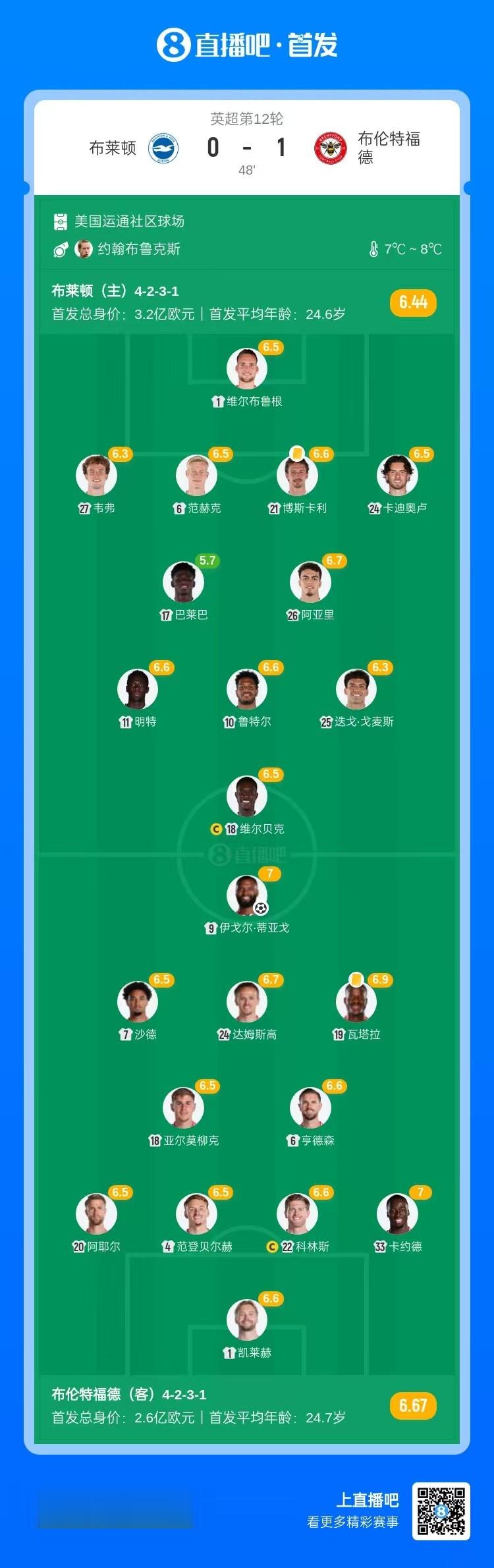 直播吧11月22日讯北京时间23:00,英超第12轮布莱顿vs布伦特福德,比赛在美国运通社区球场打响!上半场,巴莱巴送点,伊戈尔·蒂亚戈点射破门!半场结束,布莱顿暂时0-1落后布伦特福德。