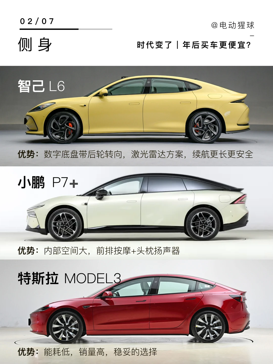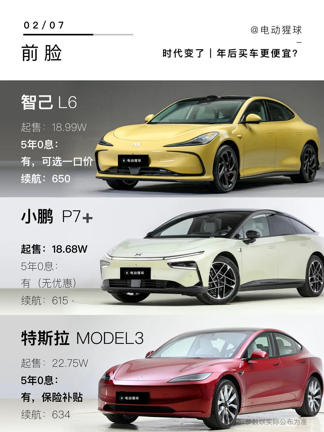 🕐时代变了!都知道年底是购车好时机❗️结果今年开年势头更猛❓ 20万级3️⃣款热门纯电轿车,都祭出王炸💥,哪一款更值得买? - 1️⃣智己L6 优势:开年直接🕐限时限量一口价18.99万起❗️曾经可是入门约22万的配置,75度电池实打实650左右续航,💡几个独有的关键配置:智己的数字底盘口碑不错,主打操控,甚至还有🛞后轮转向这种高端配置,⤴️开车掉头、转弯很easy,3️⃣款车中只有智己采用激光雷达方案❗️国内主流还是激光雷达方案靠谱,而且全国NOA已经开启,也就是说,提车就能用,全国都能开,⛰️日常出行、旅游,让它自己辅助你开就够了,💆🏻‍♀️轻松又惬意,🖥️副驾屏也是智己才有,出行不再无聊,🎬看看剧就到目的地了~ - 2️⃣小鹏P7➕ 优势:跟进了5年0息,主打车内乘坐空间大,智驾口碑不错,起售价低一丢丢,⚡️外观硬朗科技感~ - 3️⃣特斯拉Model3 优势:能耗低、销量高,品牌认可度更高,稳妥之选❗️ - 💡总的看下来,智己L6的新年力度更大,一口价先自砍一刀不玩套路,可选5年0息,还可叠加车价直减8000,而特斯拉是保险补贴,智己明显更有诚意~ 追求更低裸车价,可选一口价18.99万,还有5年12万可以提前还的分期,入手门槛相当低,关键是产品力也够顶💡全国NOA智驾已开通🛣️口碑不错的底盘与操控,还有适合家用的座舱,基本没有短板,目前一口价🕐限时限量,喜欢的朋友抓紧~ 最后,手握20万,你会怎么选?