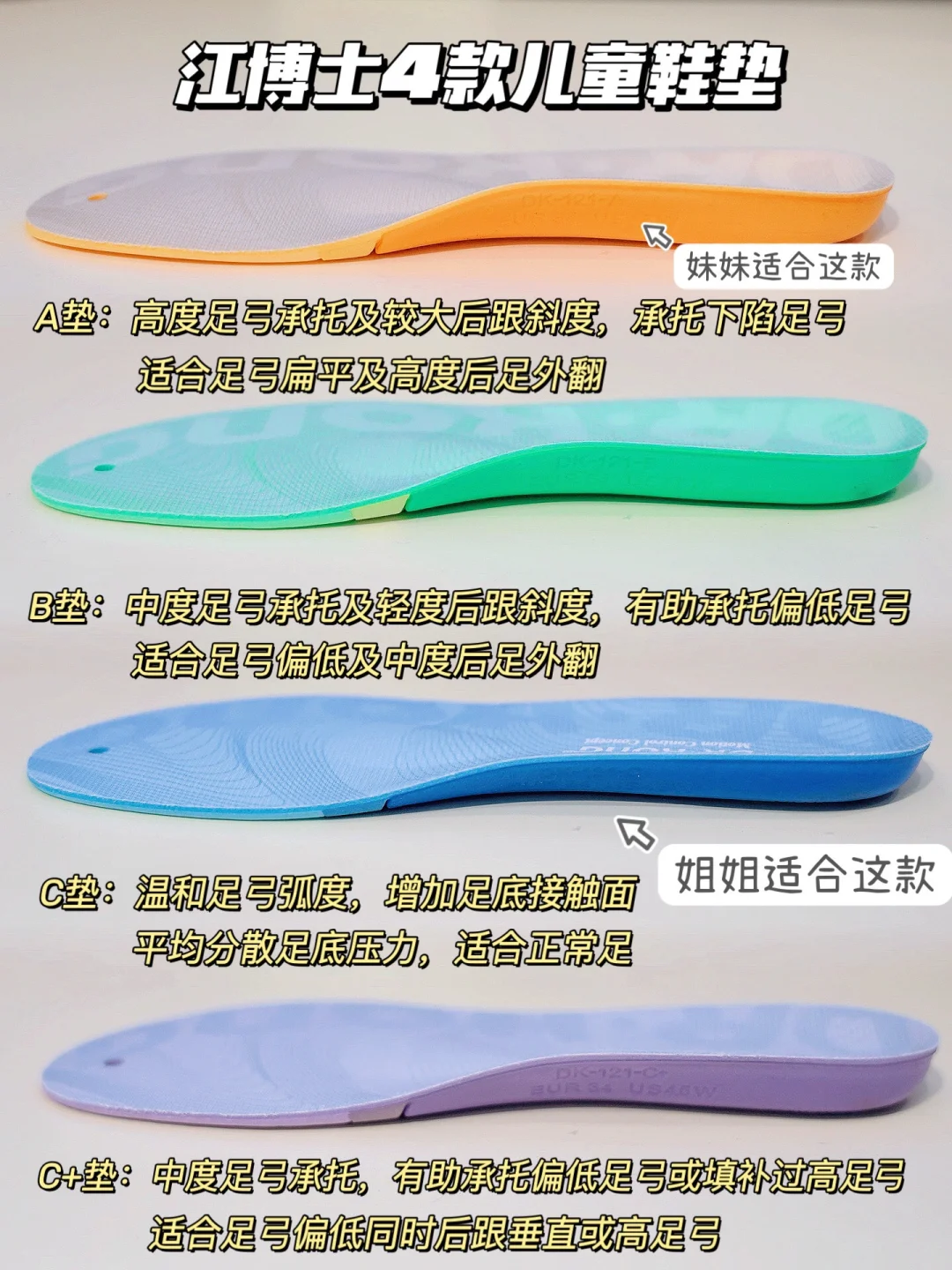 重点来了!验完脚,店员小姐姐会根据报告推荐适合的鞋垫!江博士家🈶️A、B、C、C+四款儿童功能鞋垫,每款鞋垫的足弓弧度和后跟斜度都不一样,适配不同的脚型👣