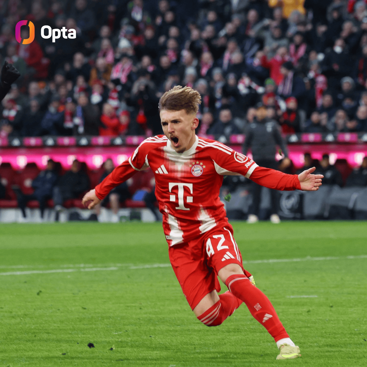 自德甲2004-05赛季有统计以来,只有穆科科在更年轻的时候完成过单场传射(2022年对阵弗赖堡,17岁265天)。