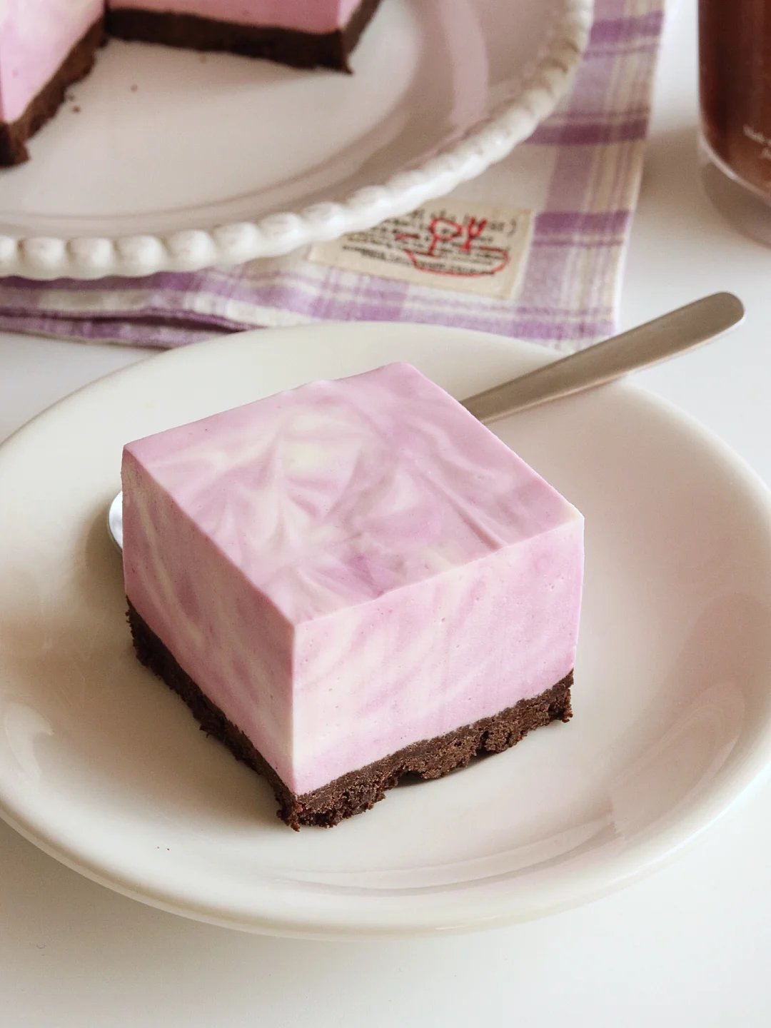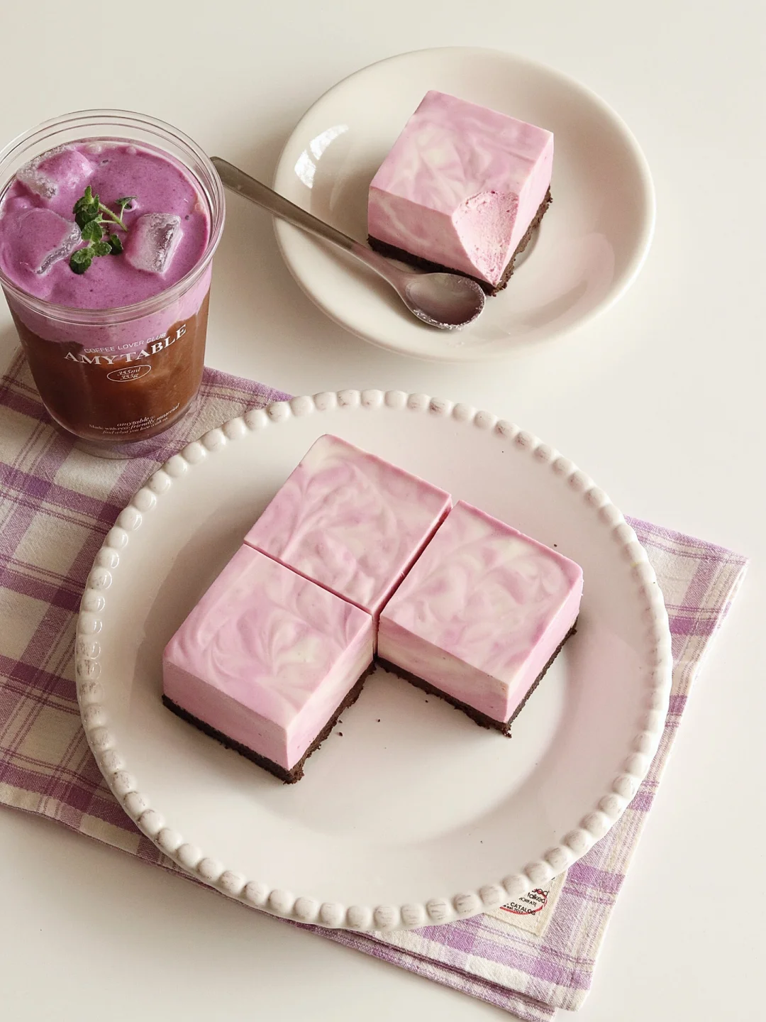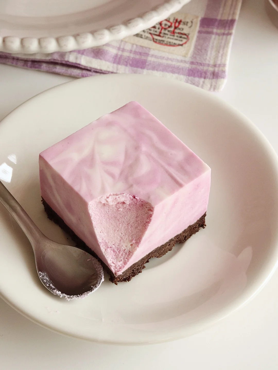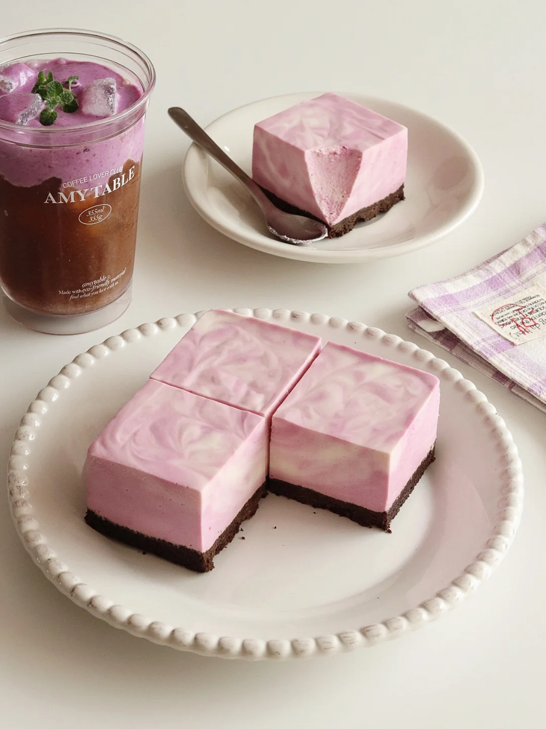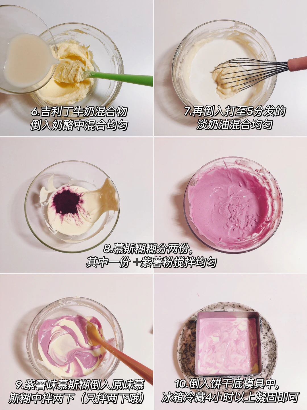 6️⃣紫薯慕斯糊倒入原味慕斯糊中拌两下(只拌两下哦)倒入饼干底模具中,用牙签整理表面纹路,冷藏4小时以上至凝固即可✅