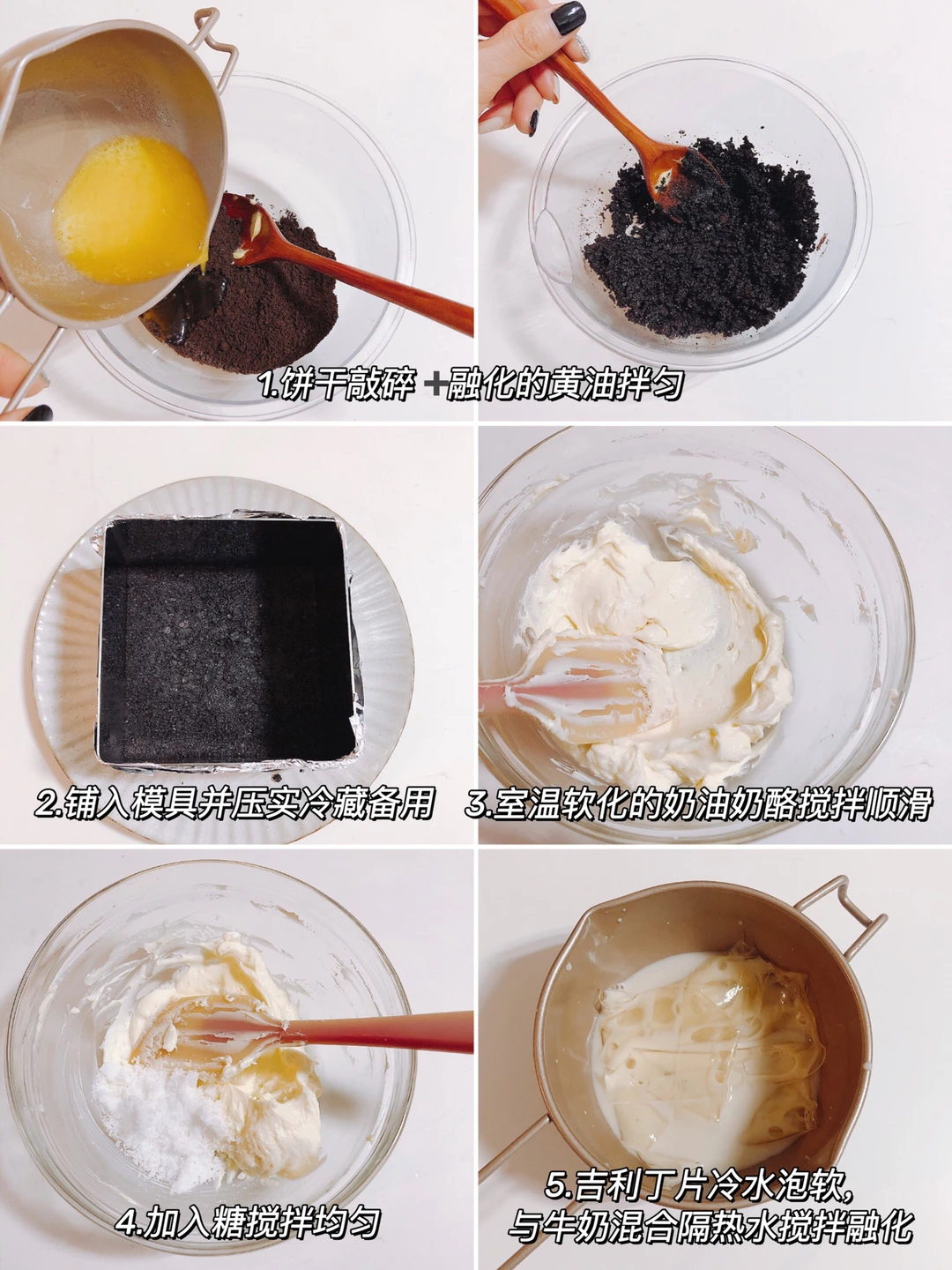 1️⃣奥利奥敲碎,加入融化的黄油🧈拌匀,铺入模具并压实,入冰箱冷藏❄️备用
