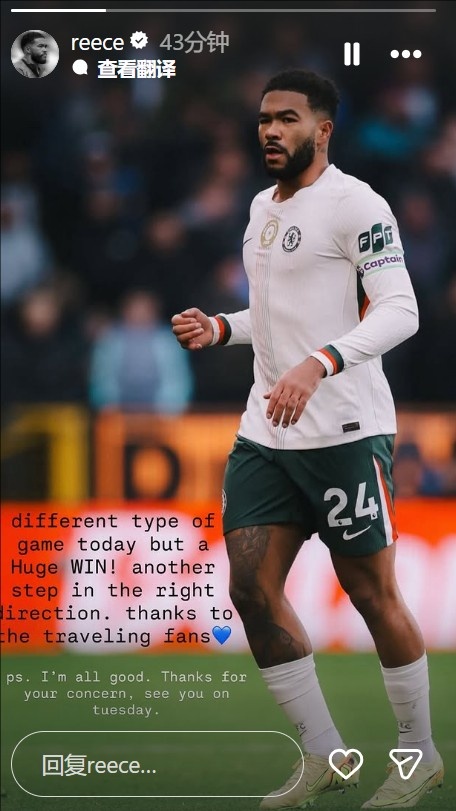 直播吧11月23日讯在切尔西2-0伯恩利的英超联赛中,里斯·詹姆斯半场被换下,他在赛后更新社交媒体报平安。