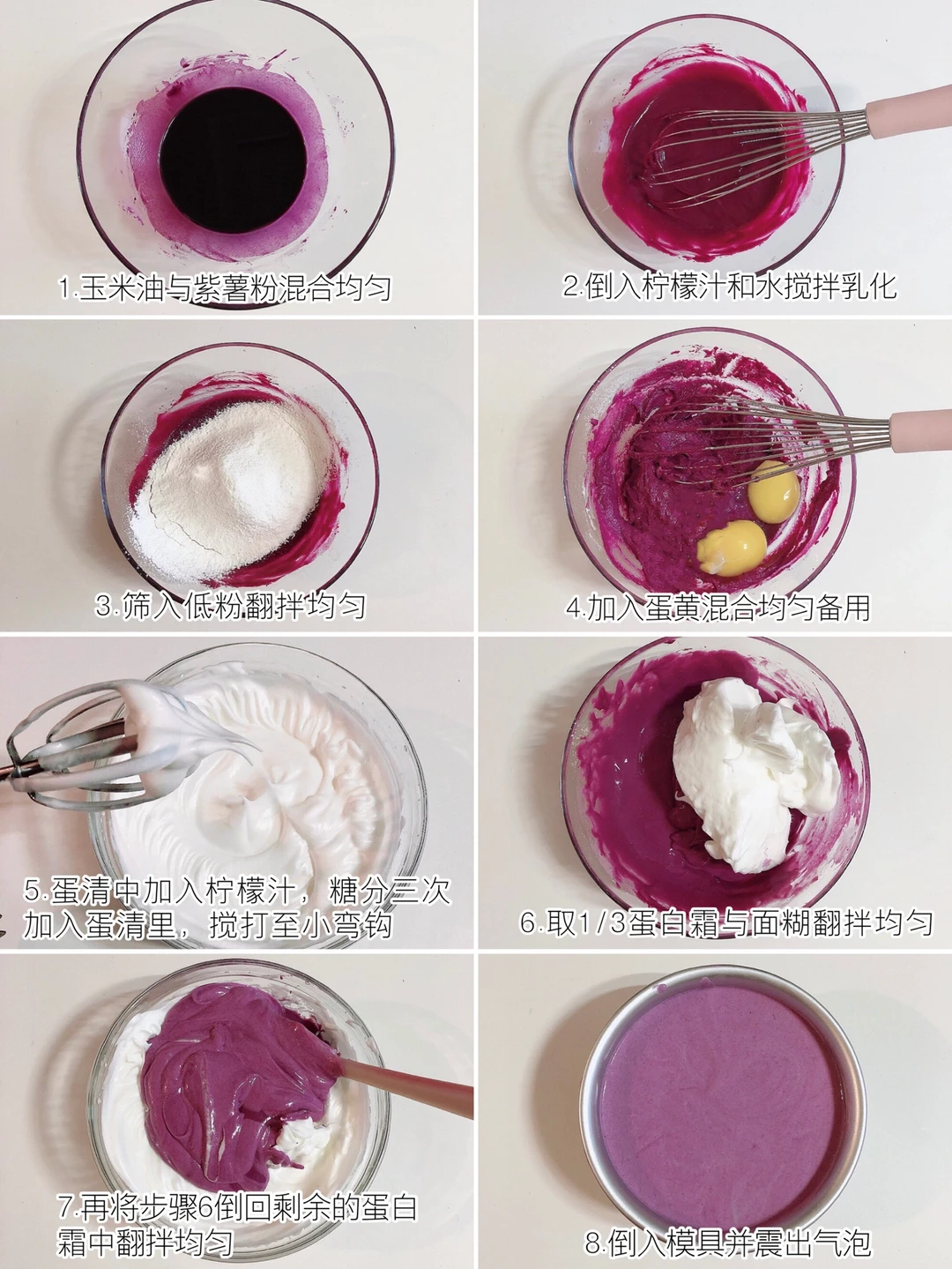 ❶分离蛋清、蛋黄备用。将紫薯粉筛入玉米油中搅拌溶解,倒入牛奶和柠檬汁搅拌乳化,筛入低粉翻拌均匀,加入2个蛋黄混合均匀备用。