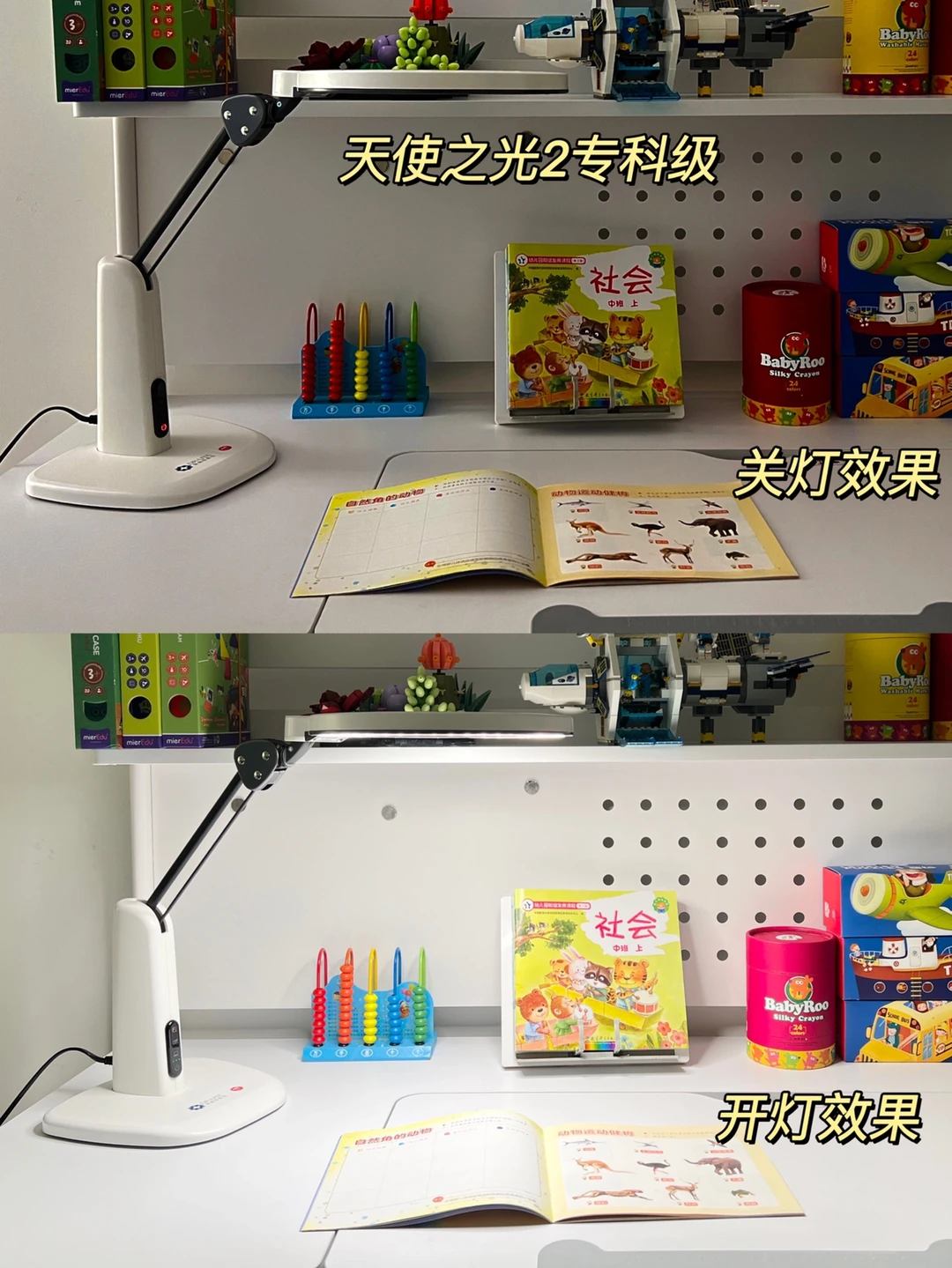 2️⃣都有三种光源模式,1是网课模式,针对电子作业线上学习制造独特的光源,减少屏幕的有害蓝光对小朋友眼睛造成伤害~2是阅读模式,孩子日常阅读写作业常用的模式~3是手工模式,主要是给小朋友画画、拼图的时候用,很简洁一键切换使用,不会分散孩子的注意力